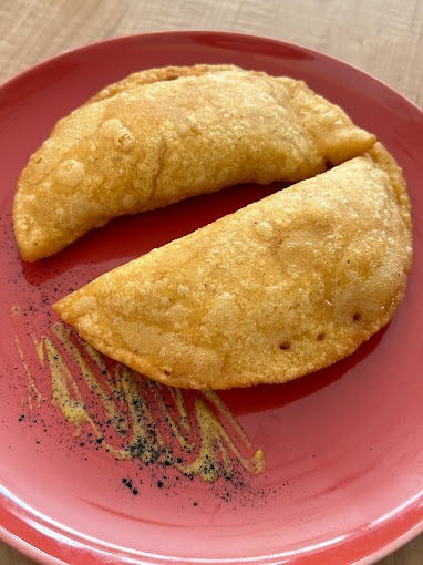 Masa amarilla de zanahoria rellena de carne deshebrada y queso gouda.