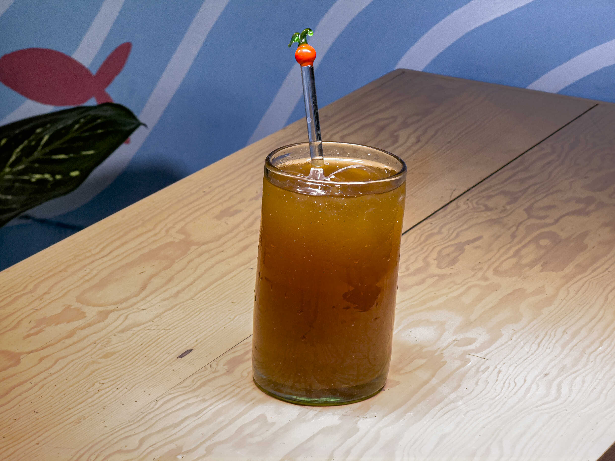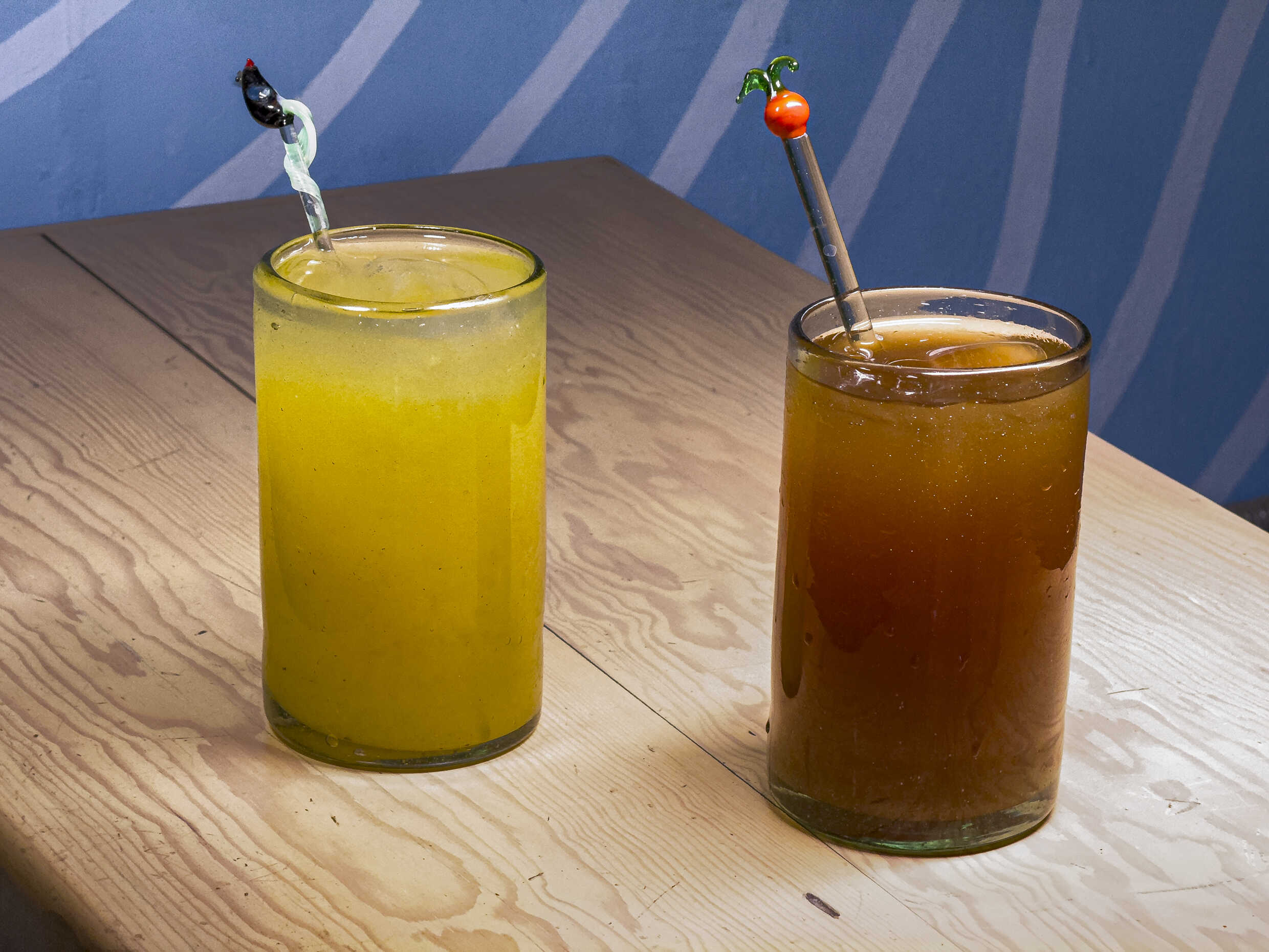 Maso azul de espirulina rellena de cochinilla pibil y cebolla encurtida.