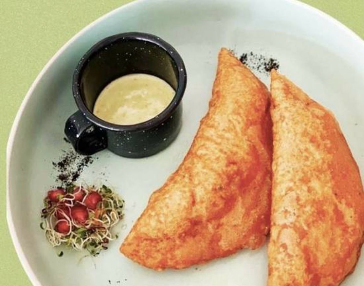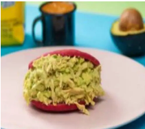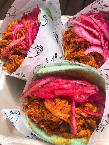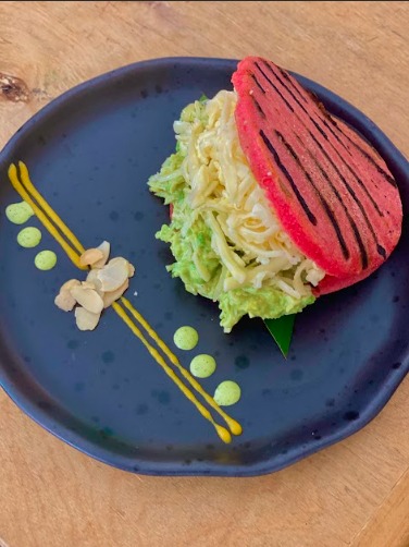 Masa con jugo de betabel rellena de pollo sazonado, aguacate y aderezo de yogurt griego.