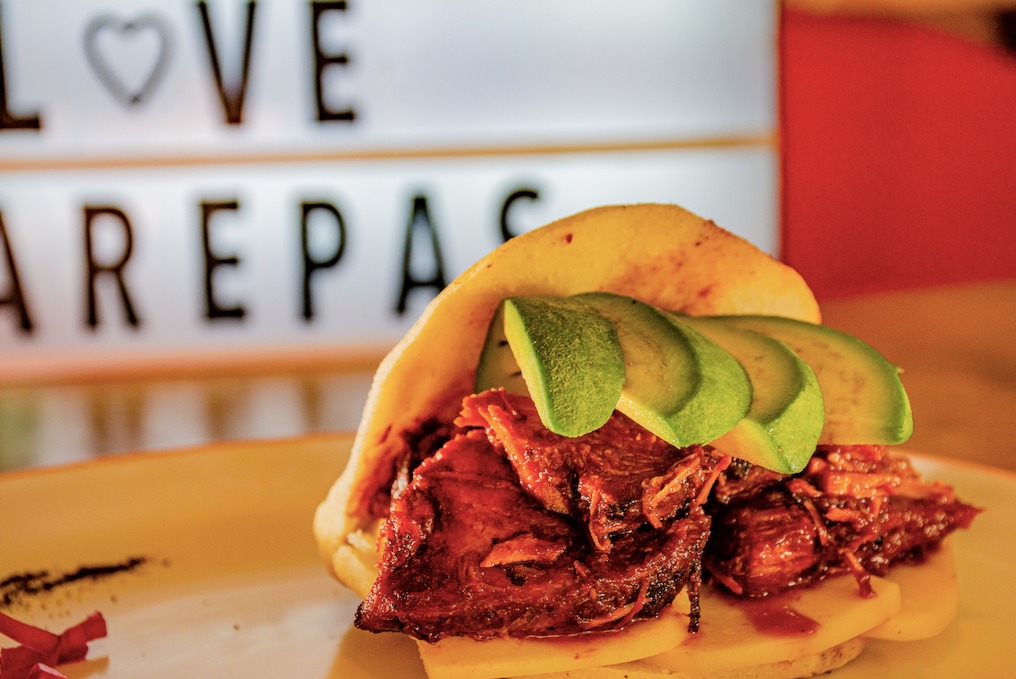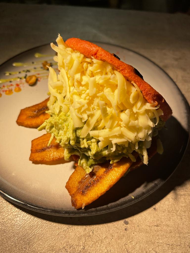 Masa blanca tradicional, rellena de carne de res marinada en salsa dulce ahumada, vino tinto y especias, acompañada con rebanadas de queso gouda y un abanico de aguacate.