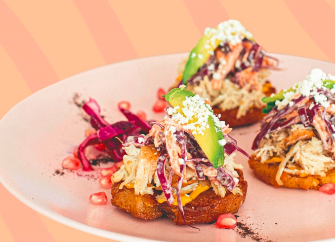 Cuatro tostaditas de plátano macho crujientes, con topping de proteína a elegir , acompañados de col y zanahoria con un toque de aderezo de ajoy cilantro, adornado con aguacate, queso cotija y cebolla encurtida