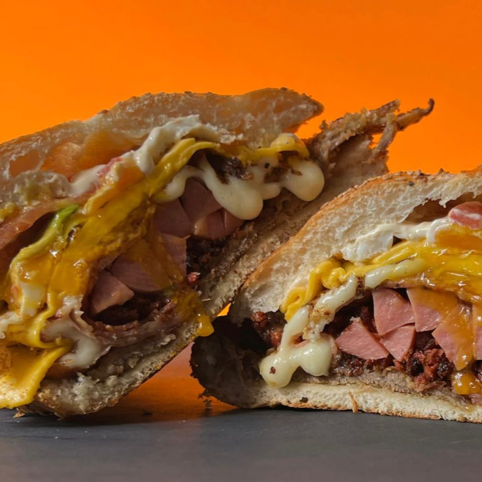 Doble carne de res ó pollo 200 gr a la plancha, tocino, doble queso amarillo, jitomate, lechuga, cátsup, mostaza y crema.