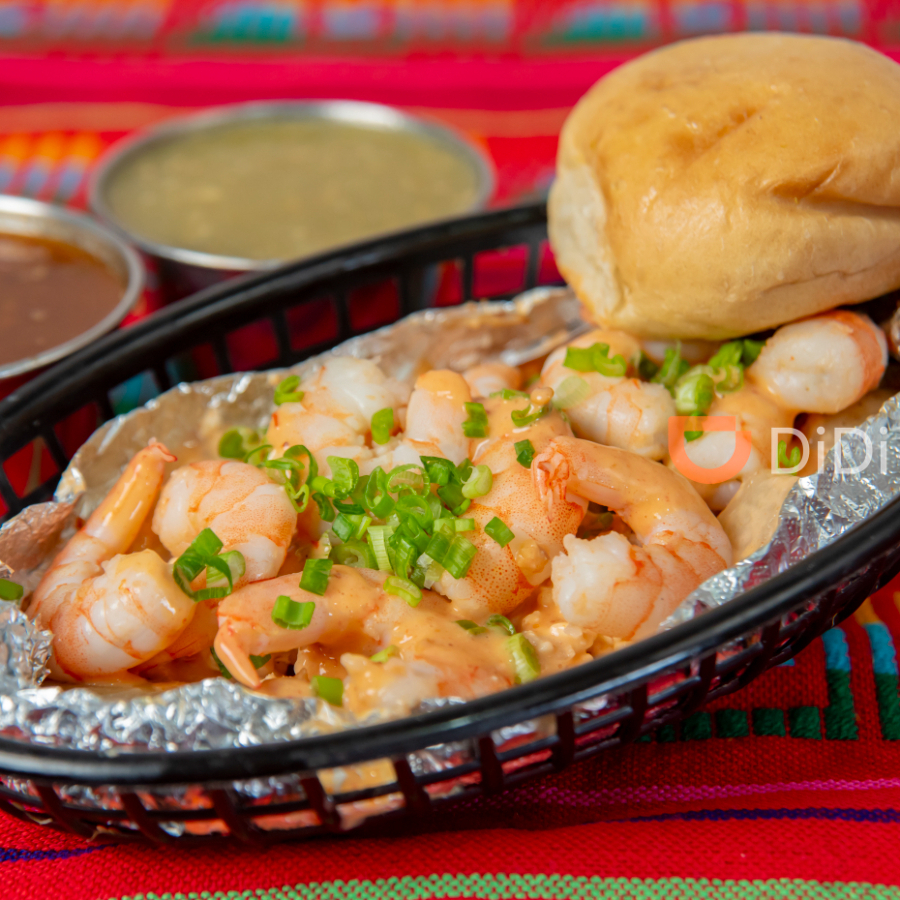 camarones en trozos de papa con aderezo chipotle y queso fundido, totopos y picante aparte