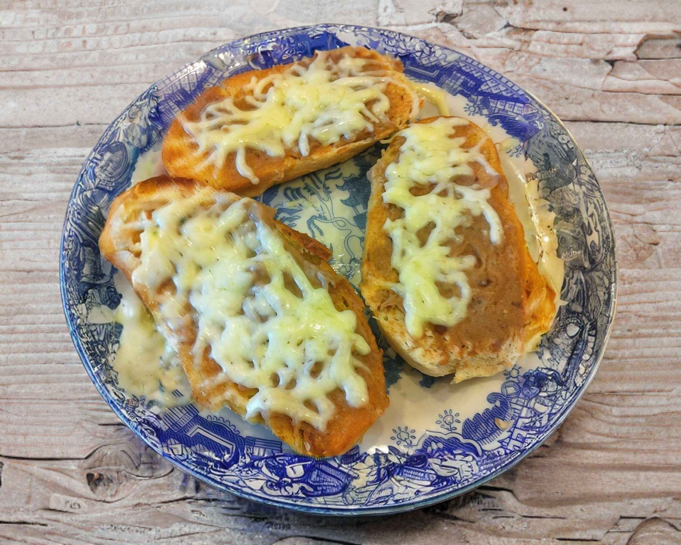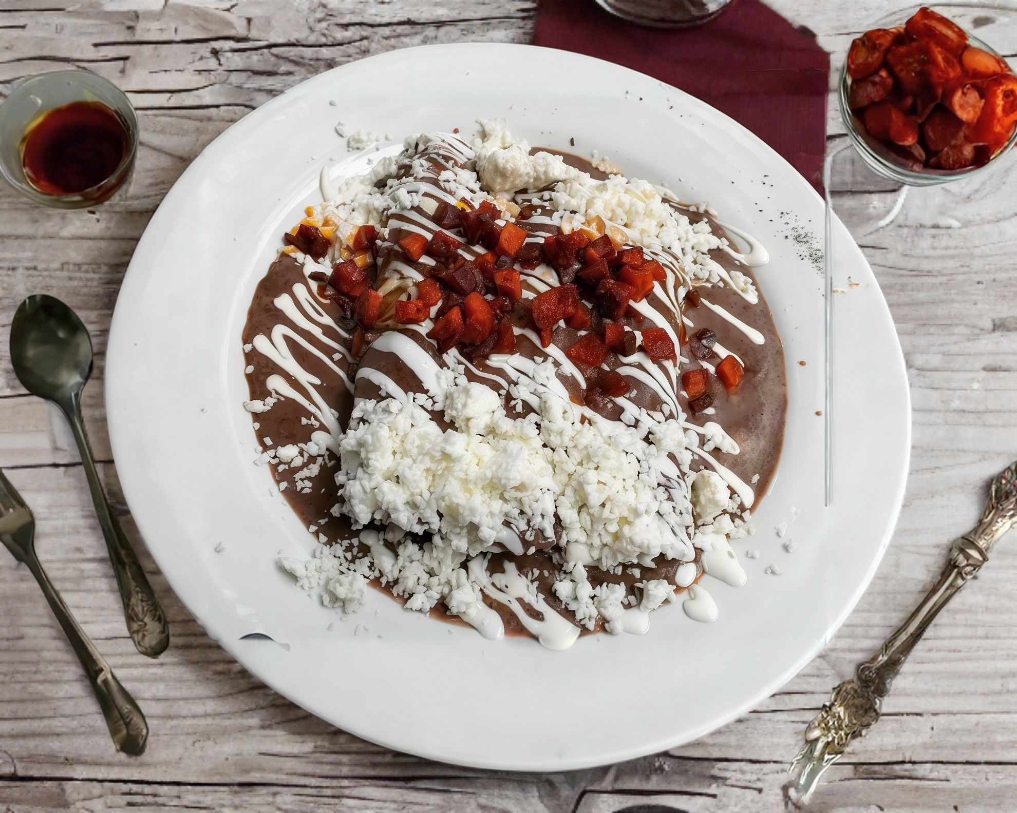 Platillo individual: con frijoles, bolillo, crema y cebolla.