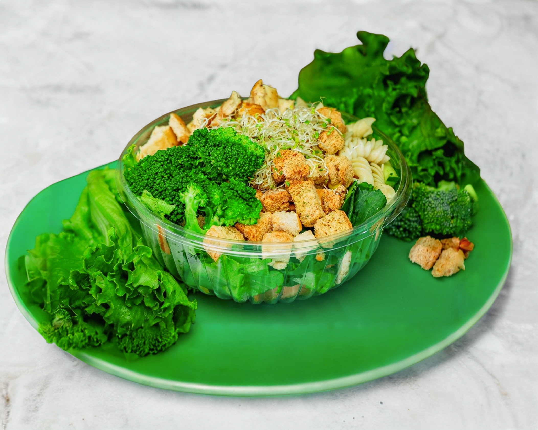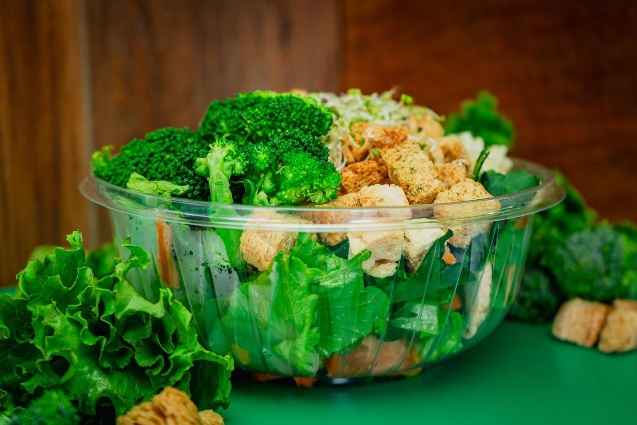 Espinacas, lechuga, zanahoria, pepino, jitomate, elote, crotones y brócoli.