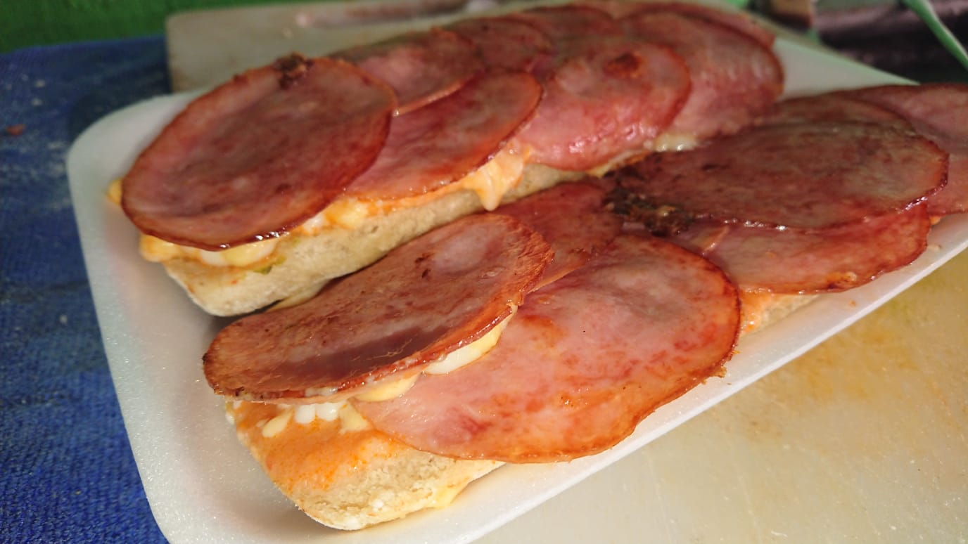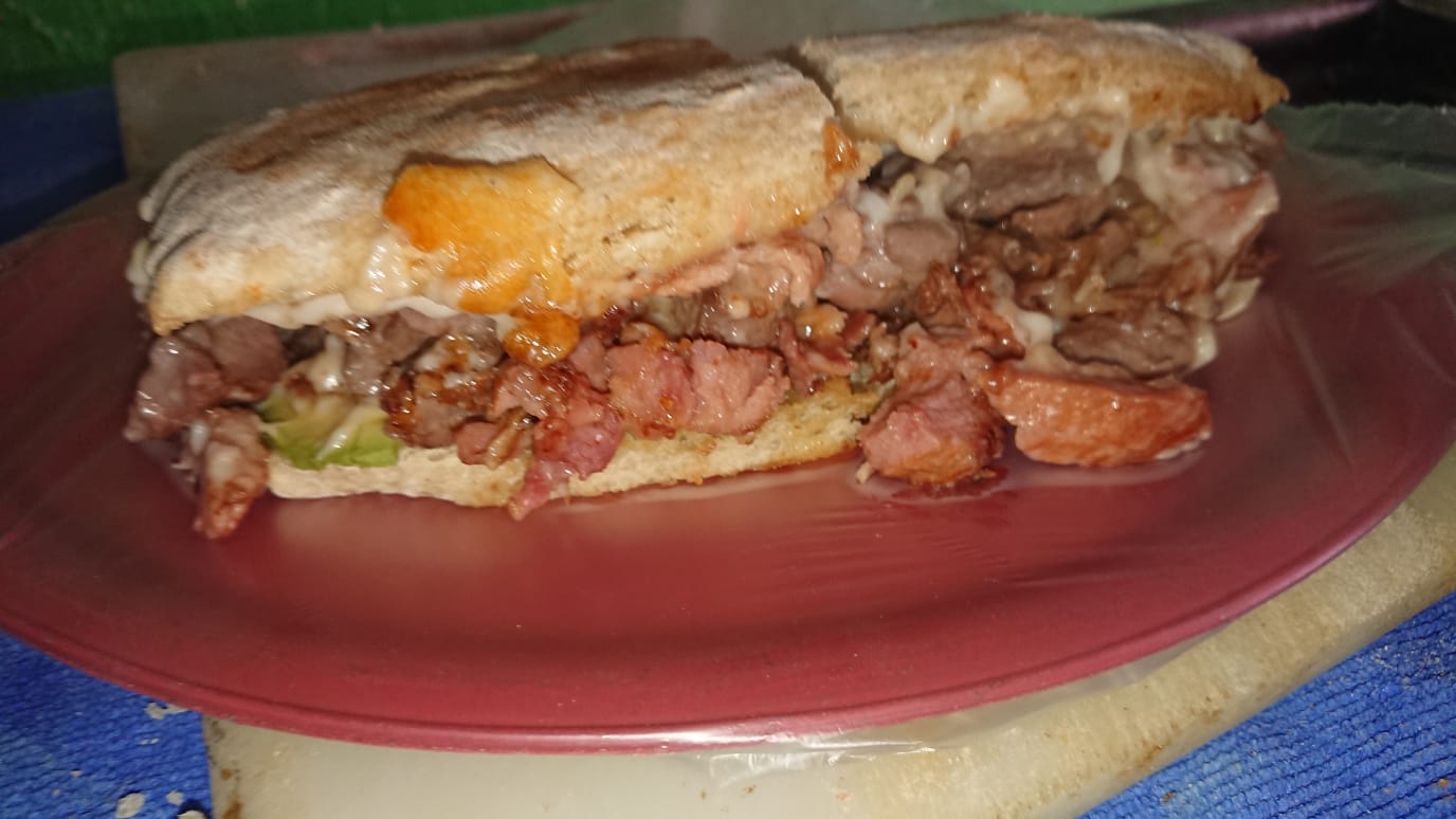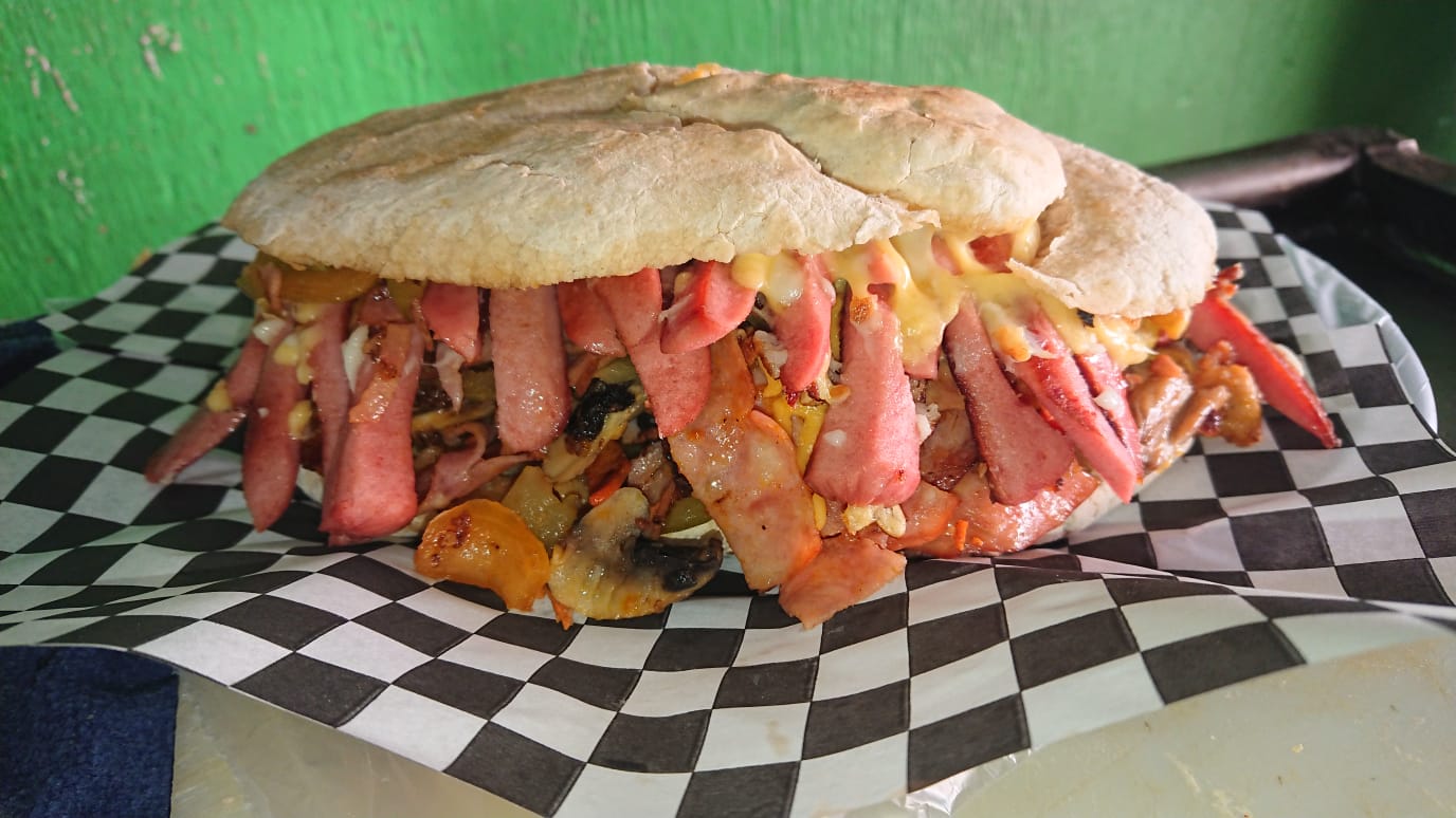 Jamón, salchicha, huevo, milanesa y queso fundido.