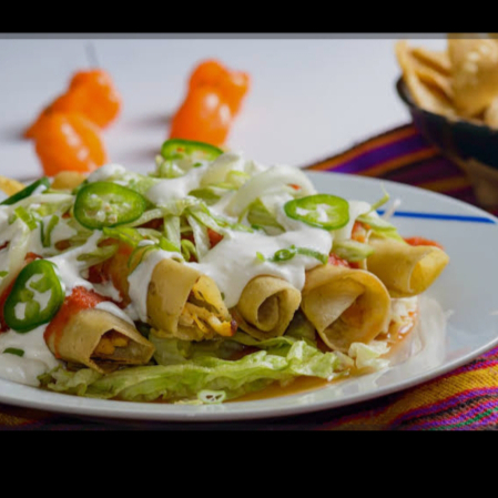 5 Tacos de pollo, guacamole, salsa de tomate, cremas , chile , todos aparte