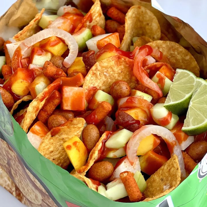 Con jicama, pepino, cueritos y cacahuate, salchicha,chamoy