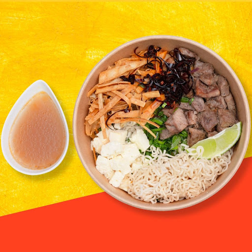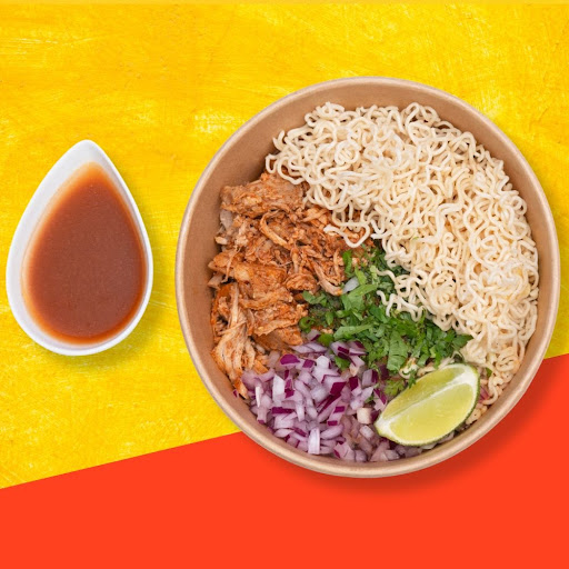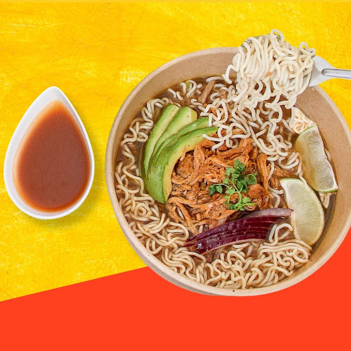 Fusión mexicana-japonesa: caldo especiado con pastor, queso fundido, tortilla crunch y toque de cebolla morada.