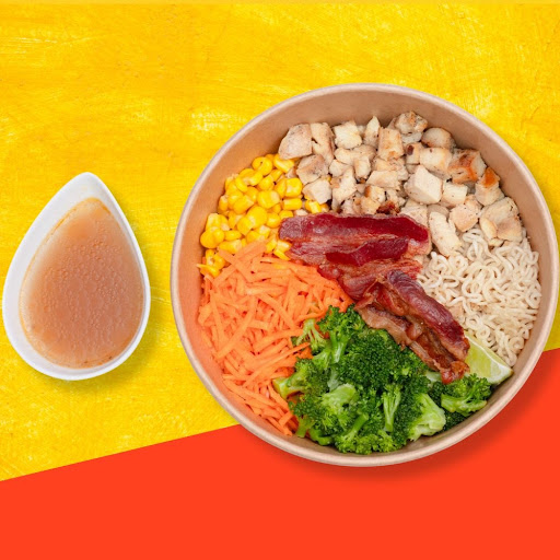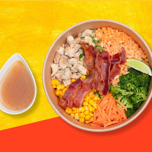 Caldo casero con pollo a la plancha, tocino dorado, brócoli, zanahoria, elote desgranado y arroz rojo. Una opción reconfortante y llena de sabor.