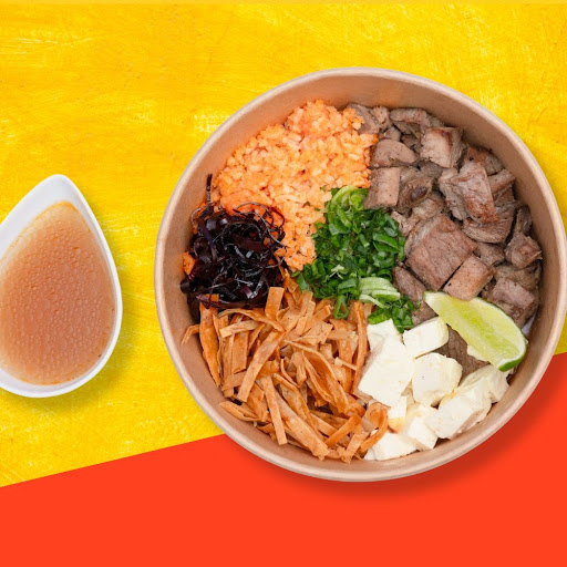 Arrachera jugosa con queso panela, tiras de tortilla, cebollín fresco, chile guajillo y arroz rojo en caldo caliente. Un consomé abundante y sabroso.
