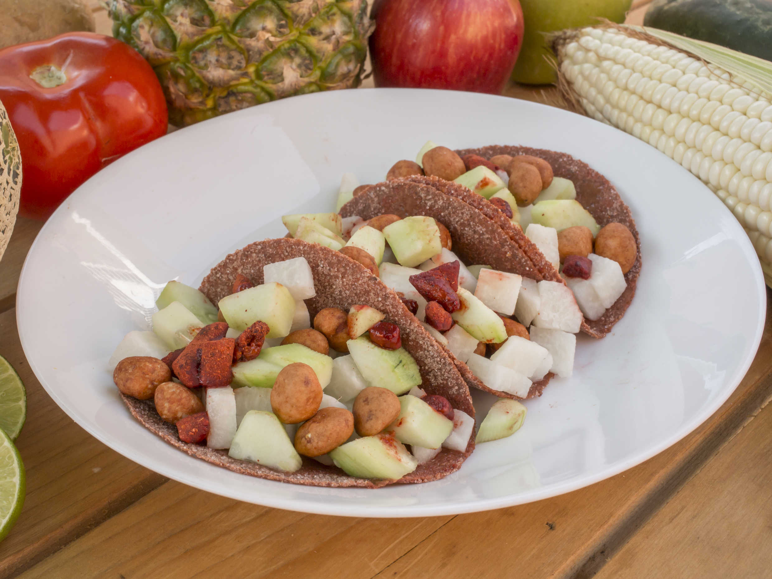 Tortilla de tamarindo, con jicama, pepino, cacahuates, chamoy, sal y limon