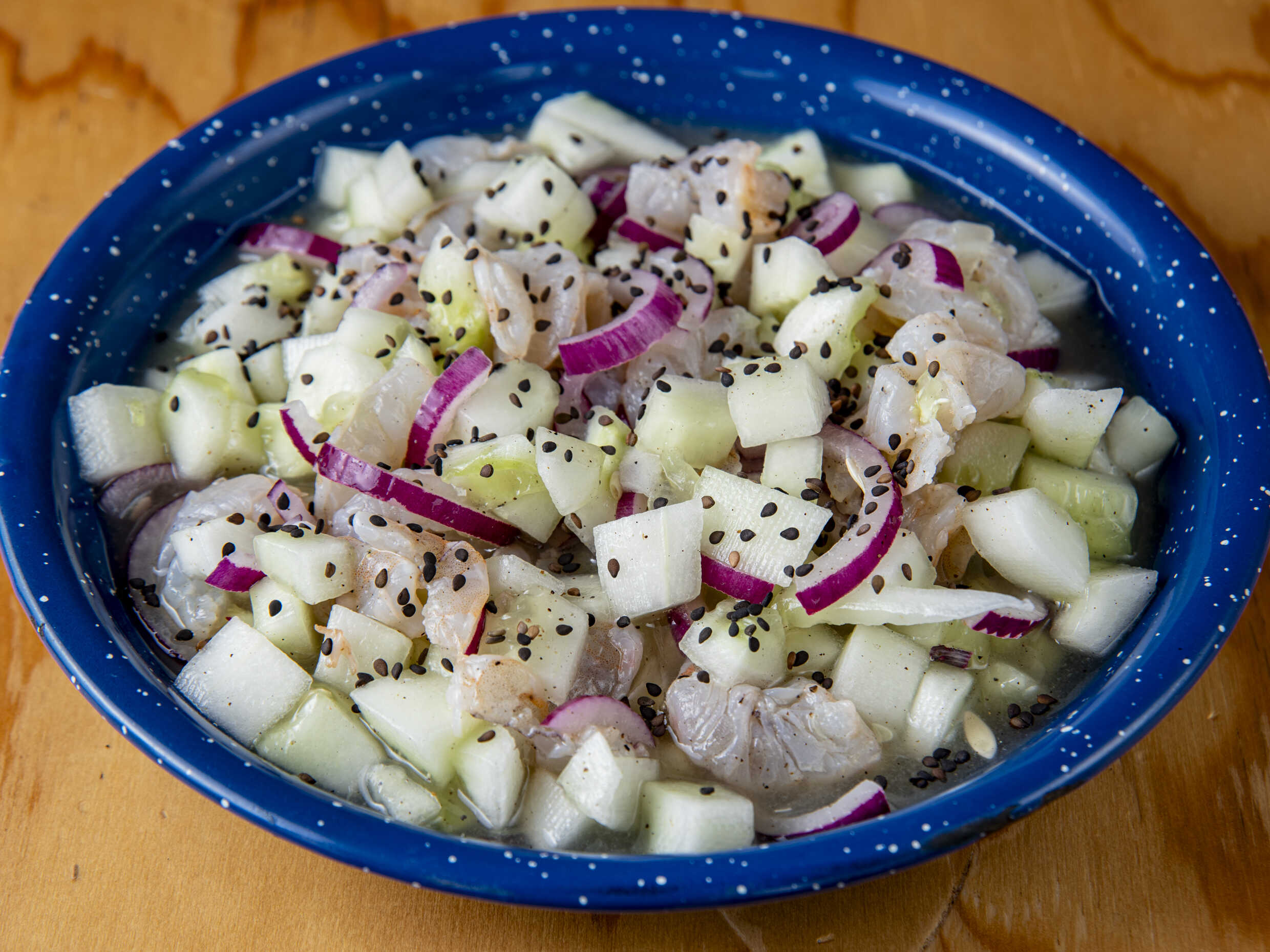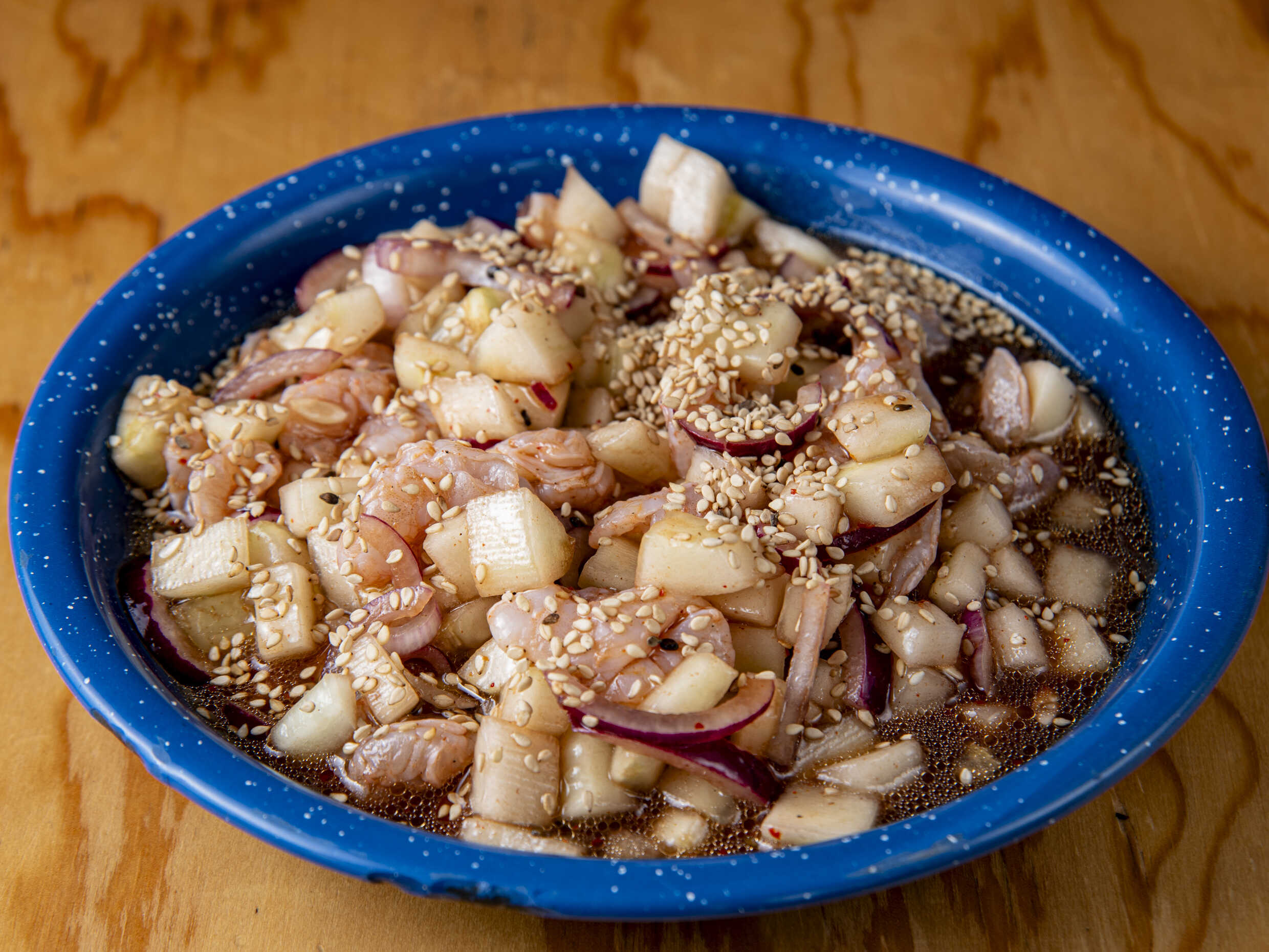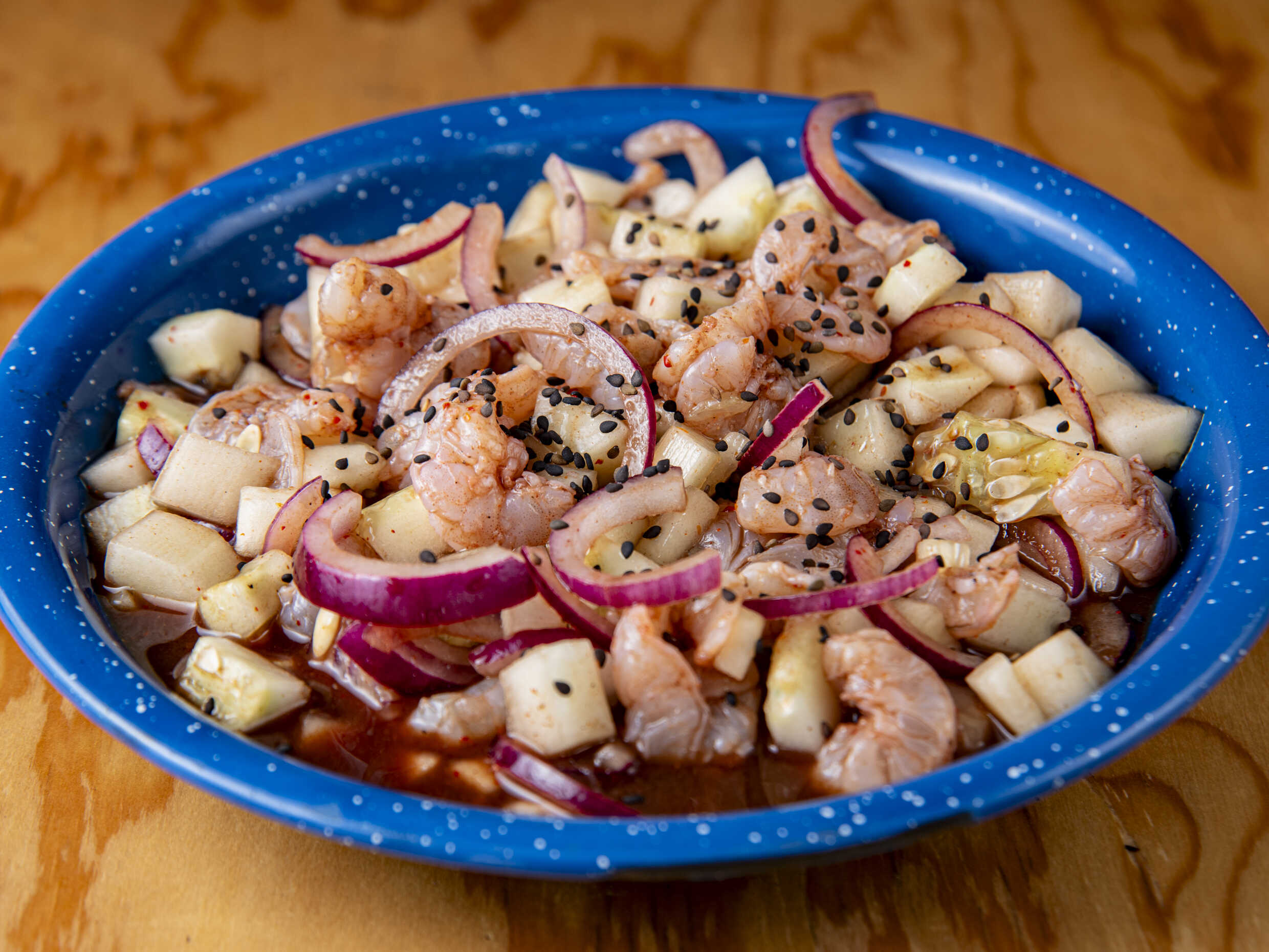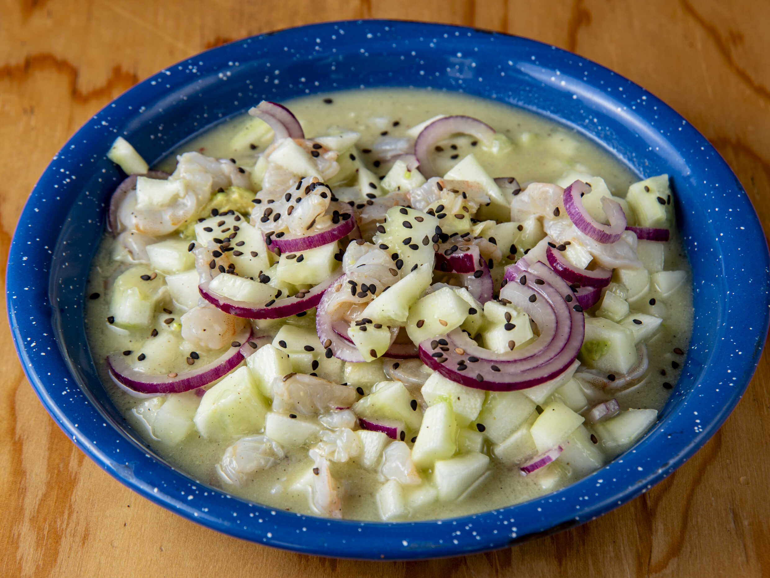 Camarón, pepino, jitomate, cebolla morada y jitomate sazonado con salsas negras y especias