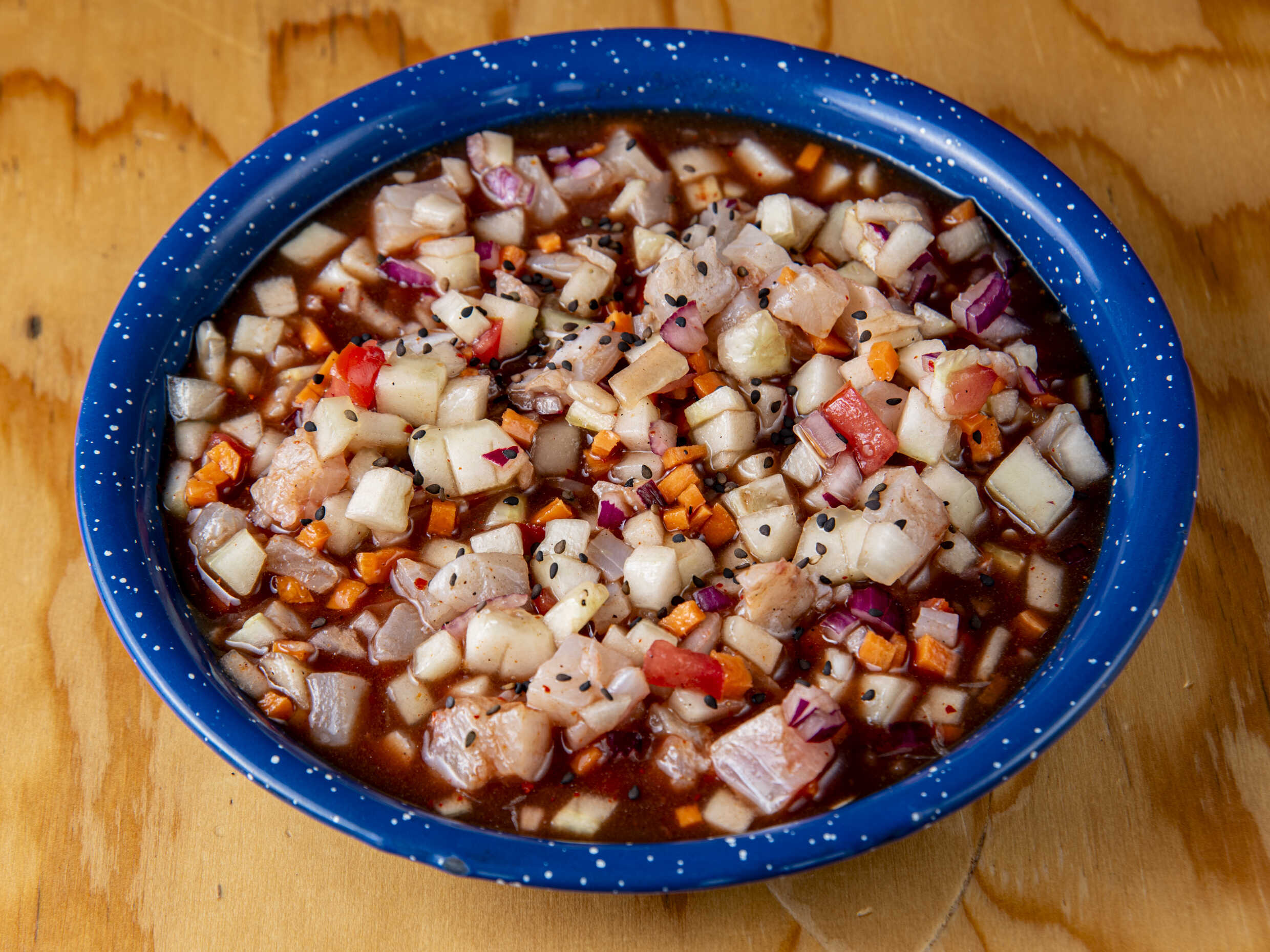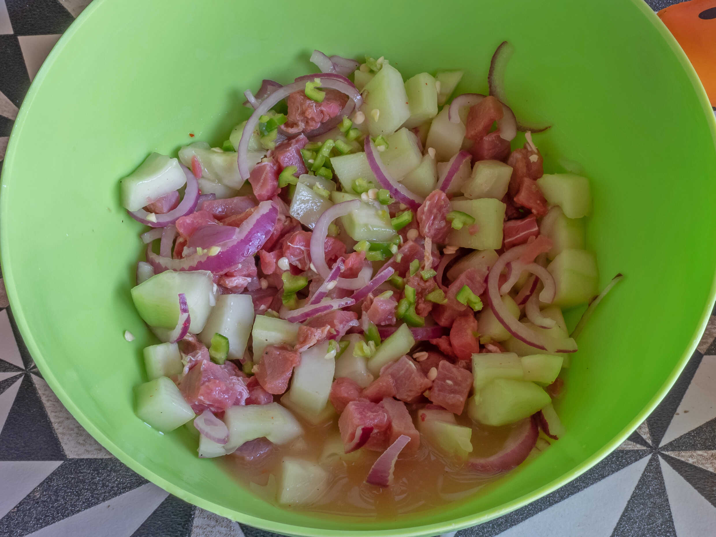 1 Lt Pescado en trozos,pepino,cebolla morada,jitomate,zanahoeia,marinado en salsas negras y chile chiltepìn, el tìpico de Sinaloa
