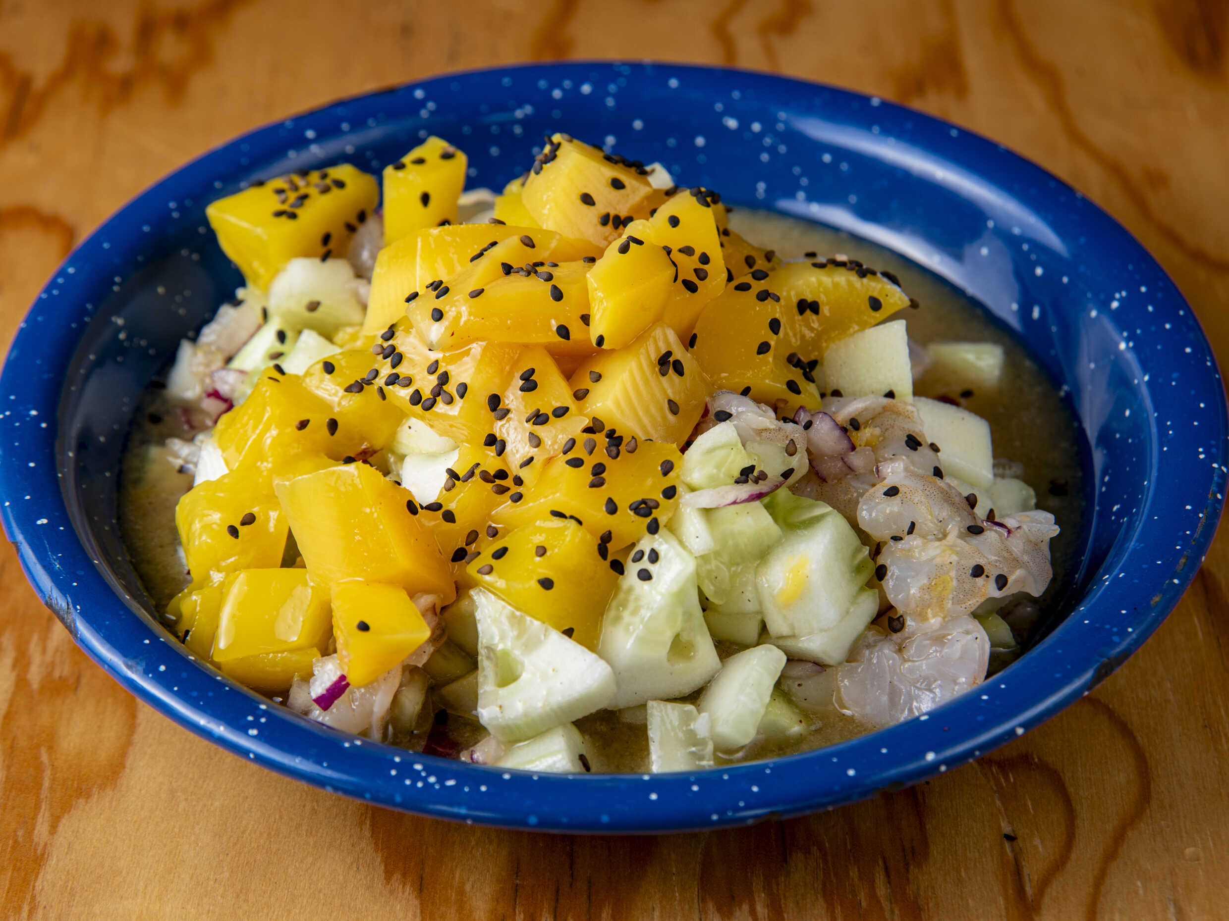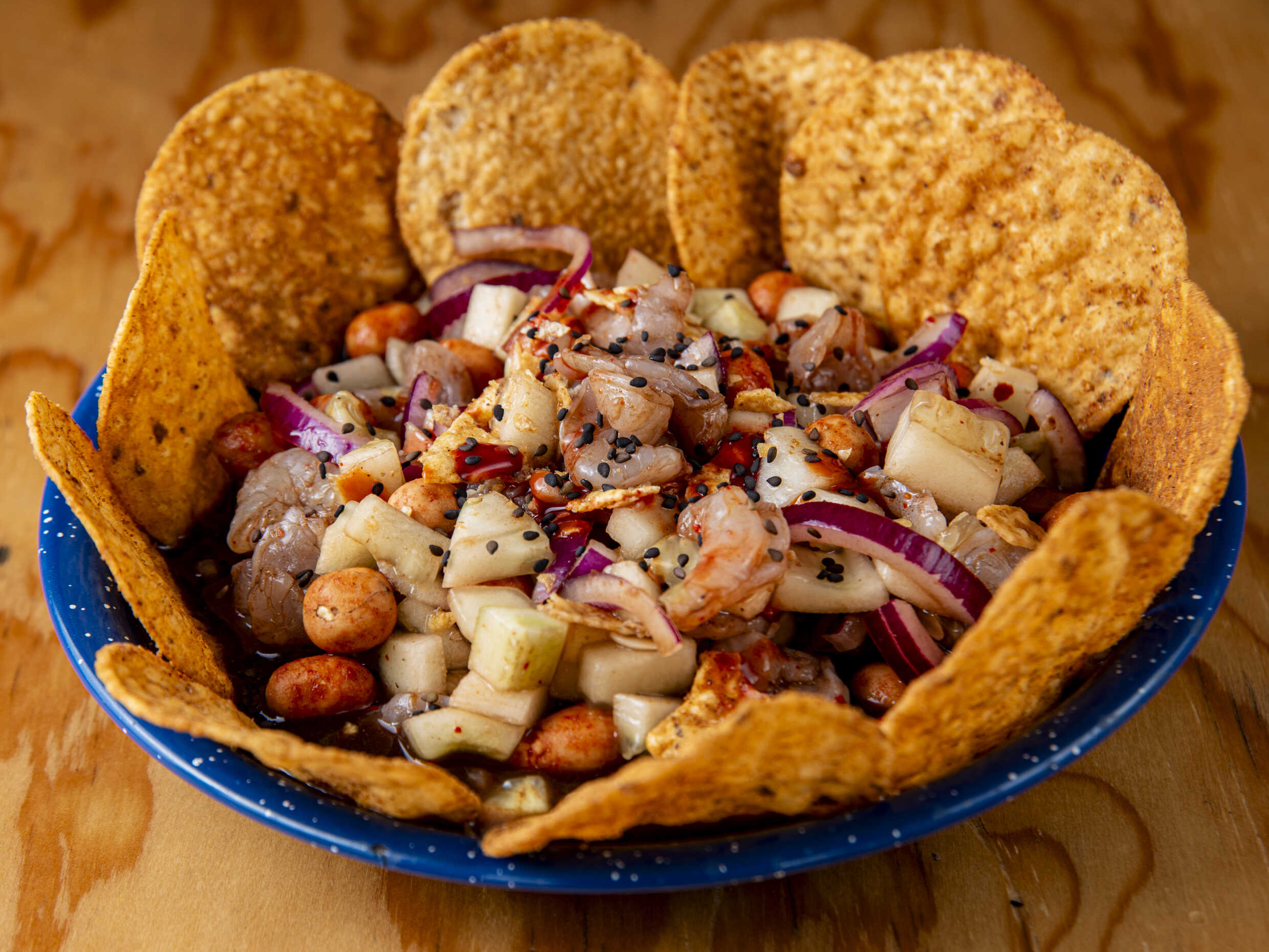 Camarón, Aguacate, mango, pepino y cebolla en cubos acompañado de una deliciosa salsa de habanero y mango.