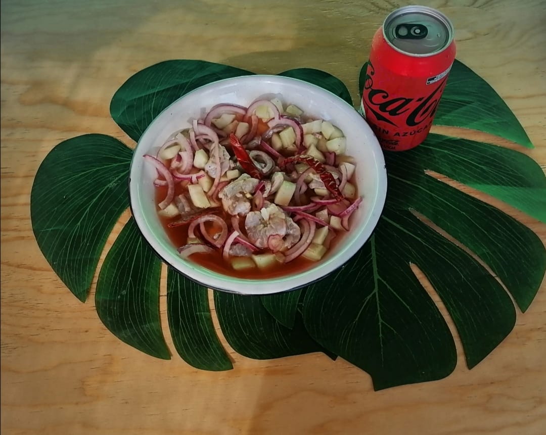 500 ml Pescado en trozos,pepino,cebolla morada,jitomate,zanahoria,marinado en salsas negras y chile chiltepìn, el tìpico de Sinaloa