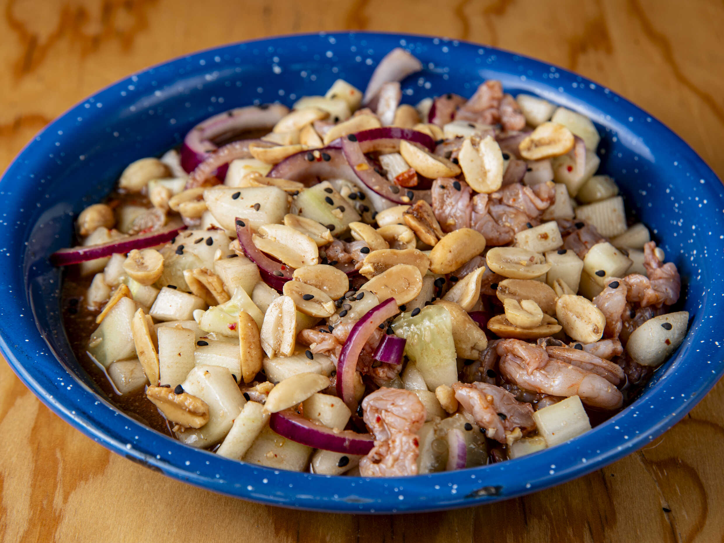 Camaron, pepino, cebolla morada, cacahuate, preparado con salasa de cacahuate, chile de arbol