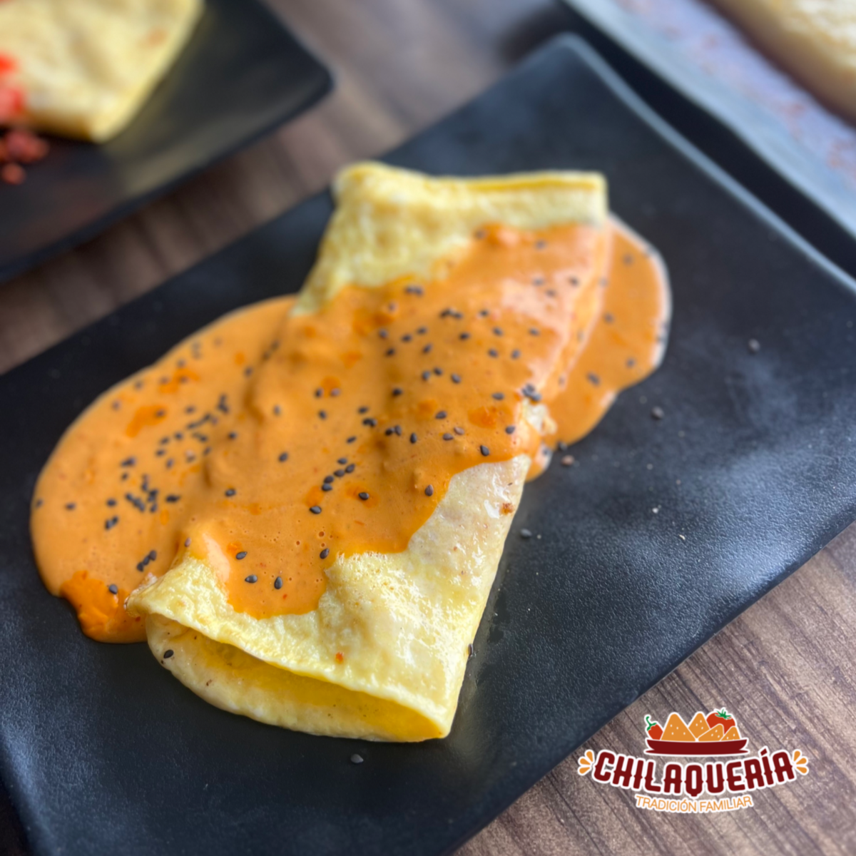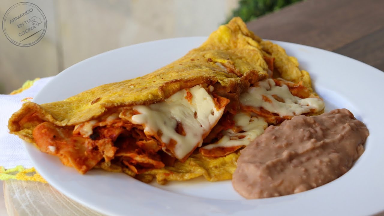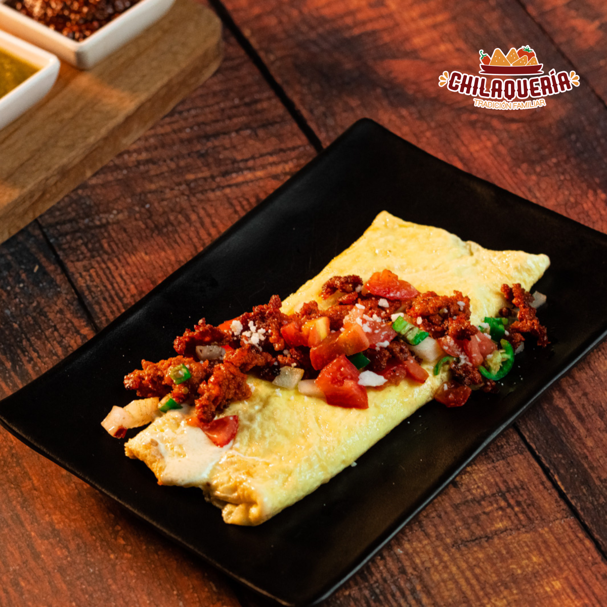 Omelette relleno de chilaquiles rojos o verdes, frijol y birote.