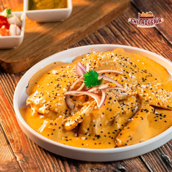 Chilaquiles con totopo dorado, salsa chipotle chilaquila, panela, chile toreado, cebolla, queso, crema, frijol y birote.