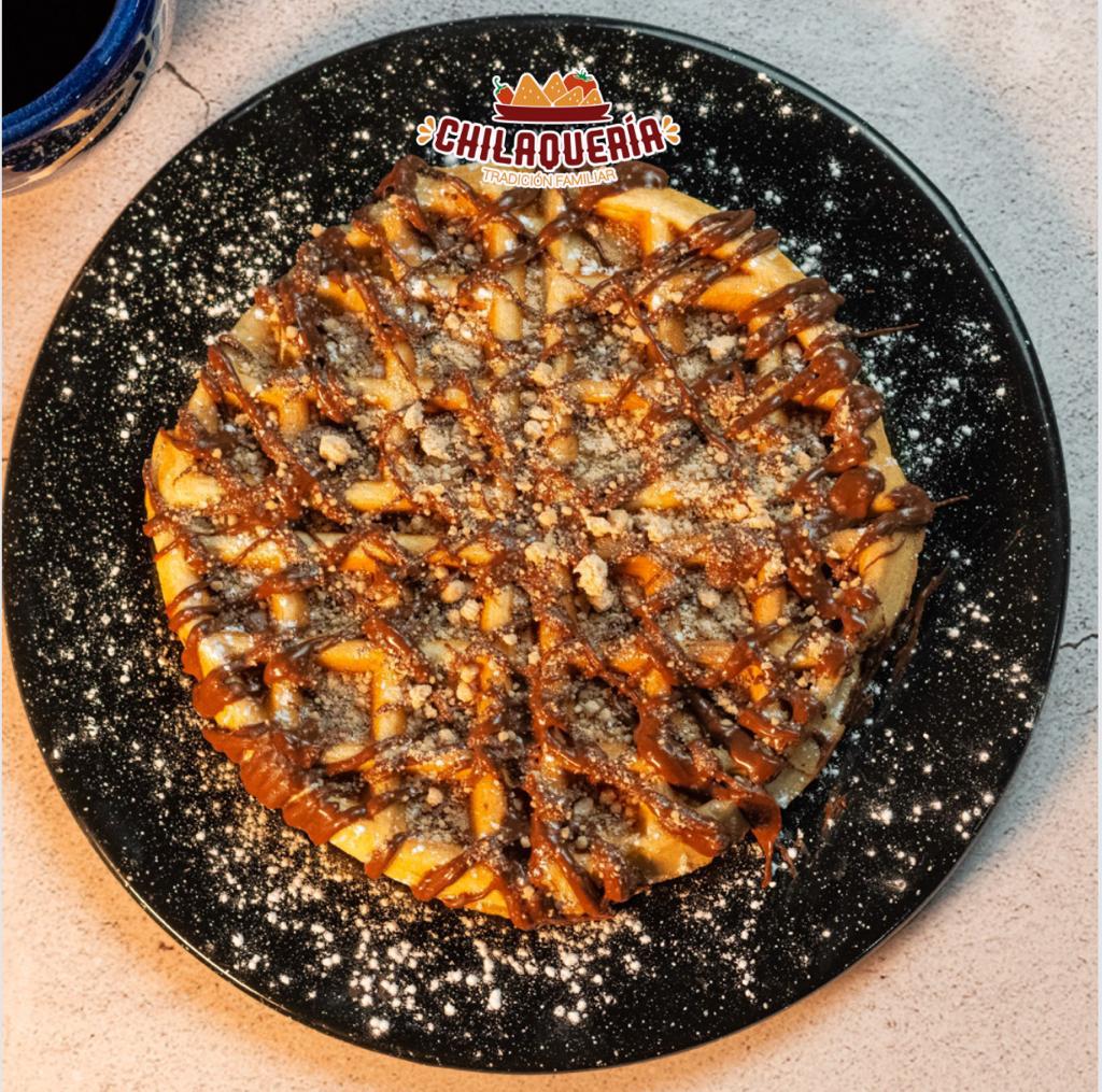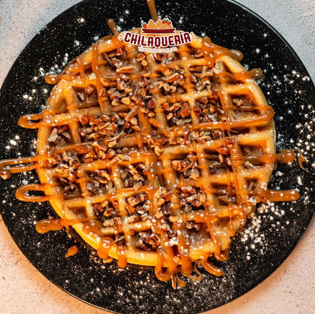 Waffle acompañado de cajeta, nuez y azúcar glass.