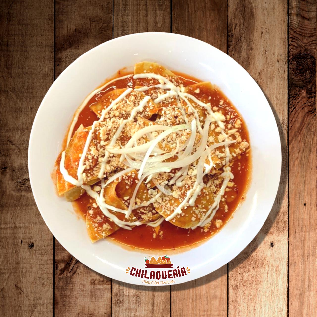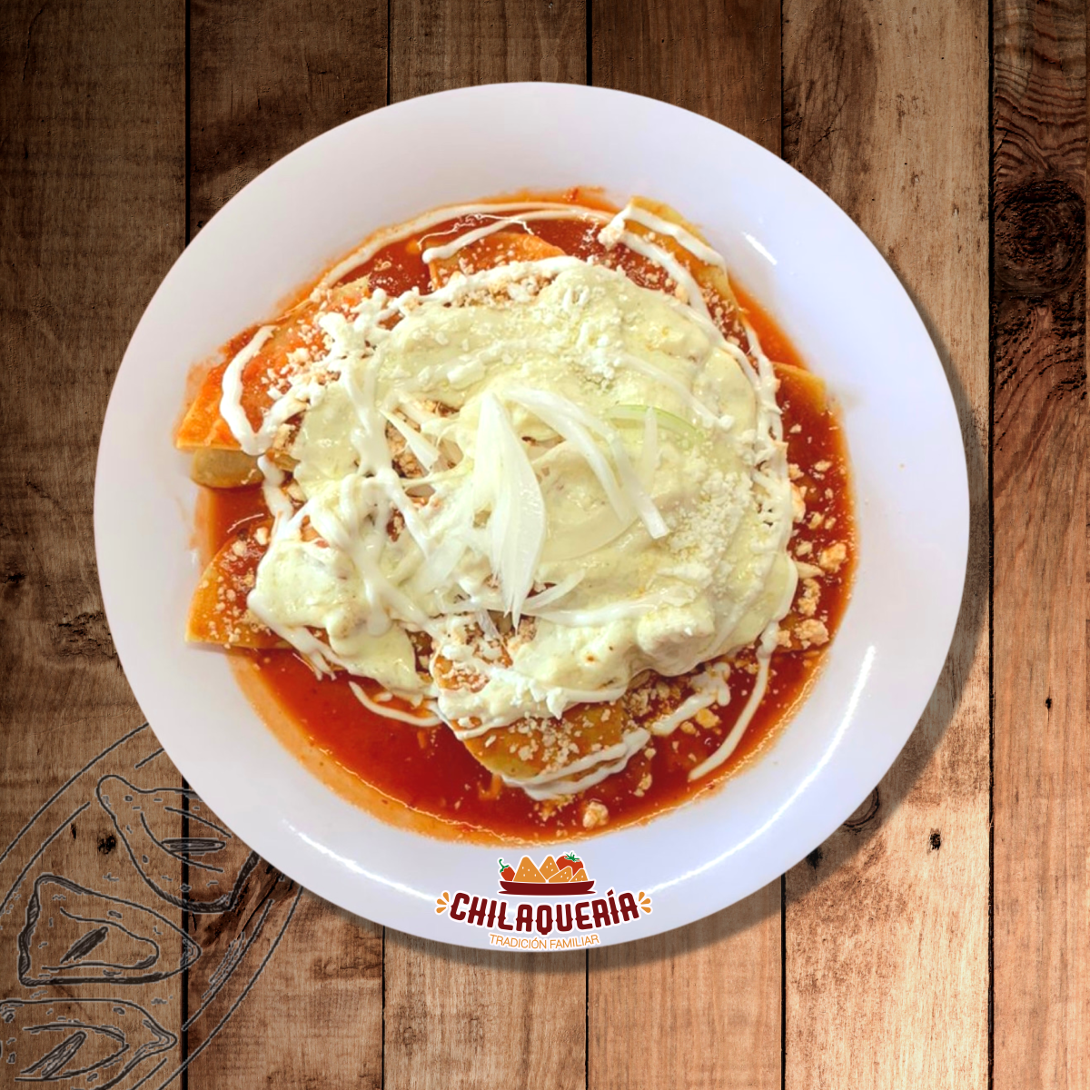 Chilaquiles rojos con totopo dorado, salsa roja, cebolla, queso, crema con frijol y birote.