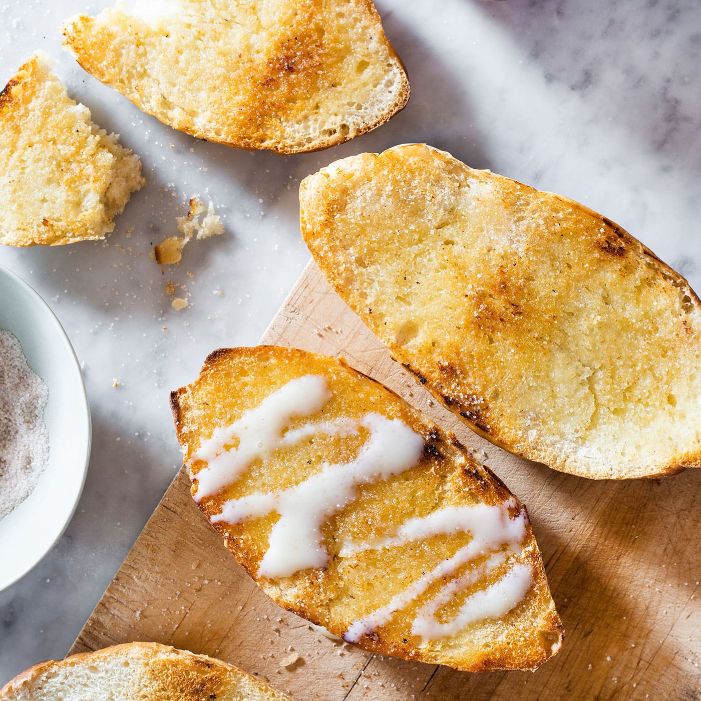 Mollete de medio birote con cama de mantequilla, con cajeta o mermelada de fresa.