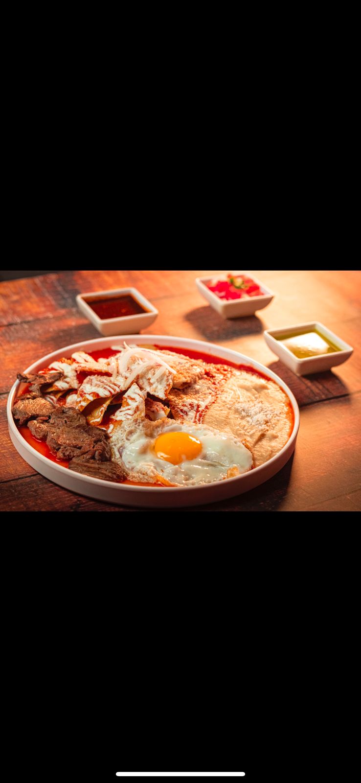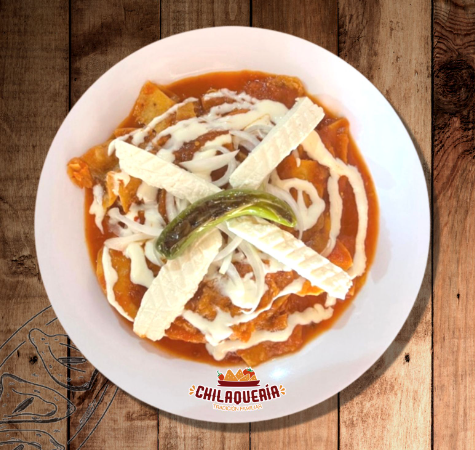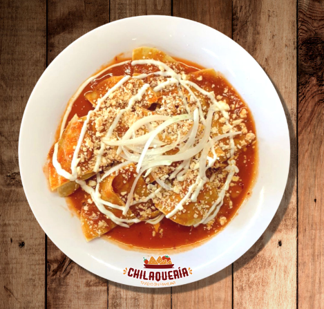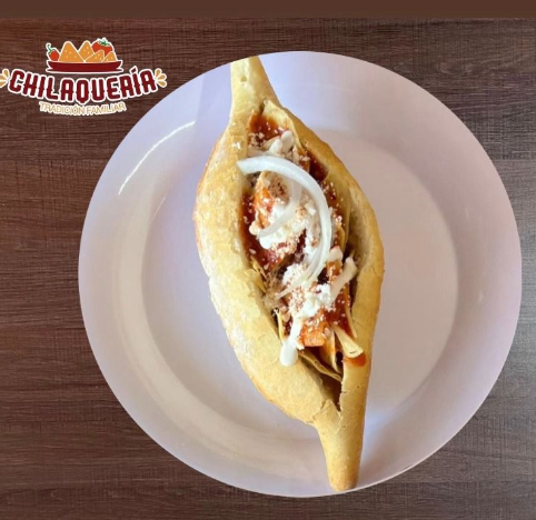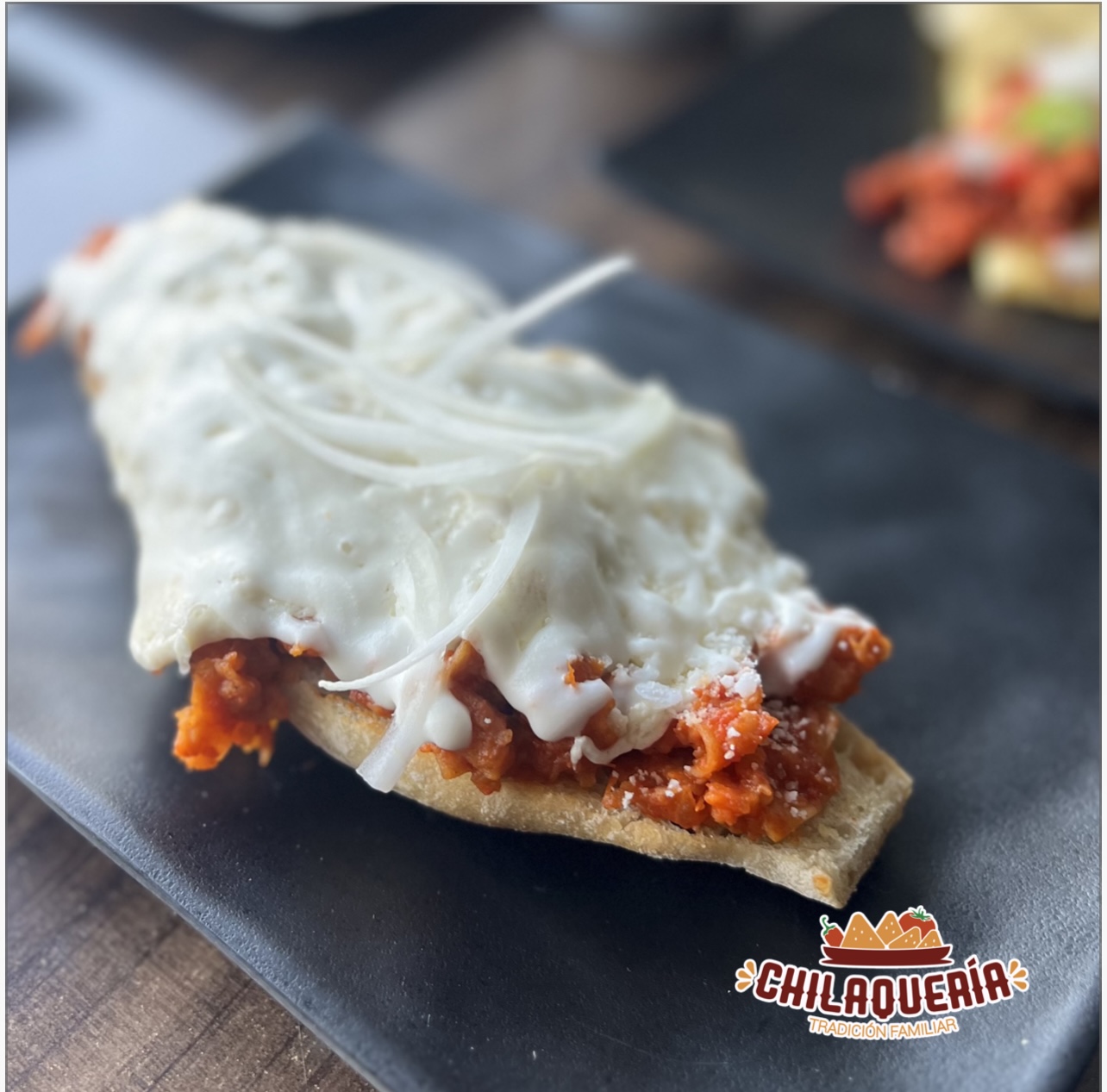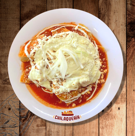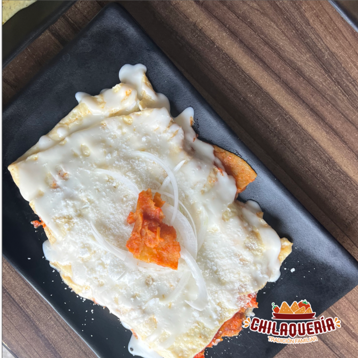 Relleno de chilaquiles rojos o verdes, queso fundido, crema, queso molido y cebolla. Incluye frijol, birote o tortillas.