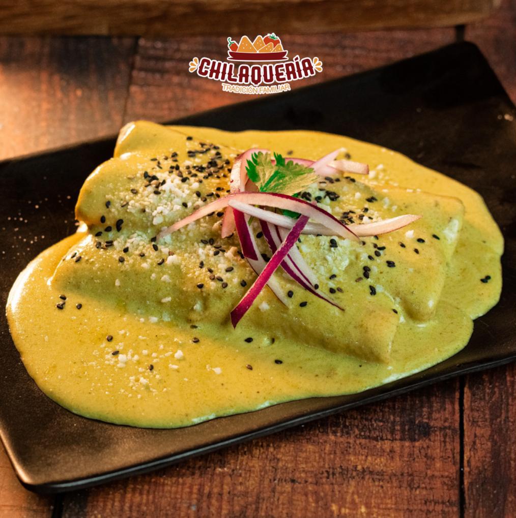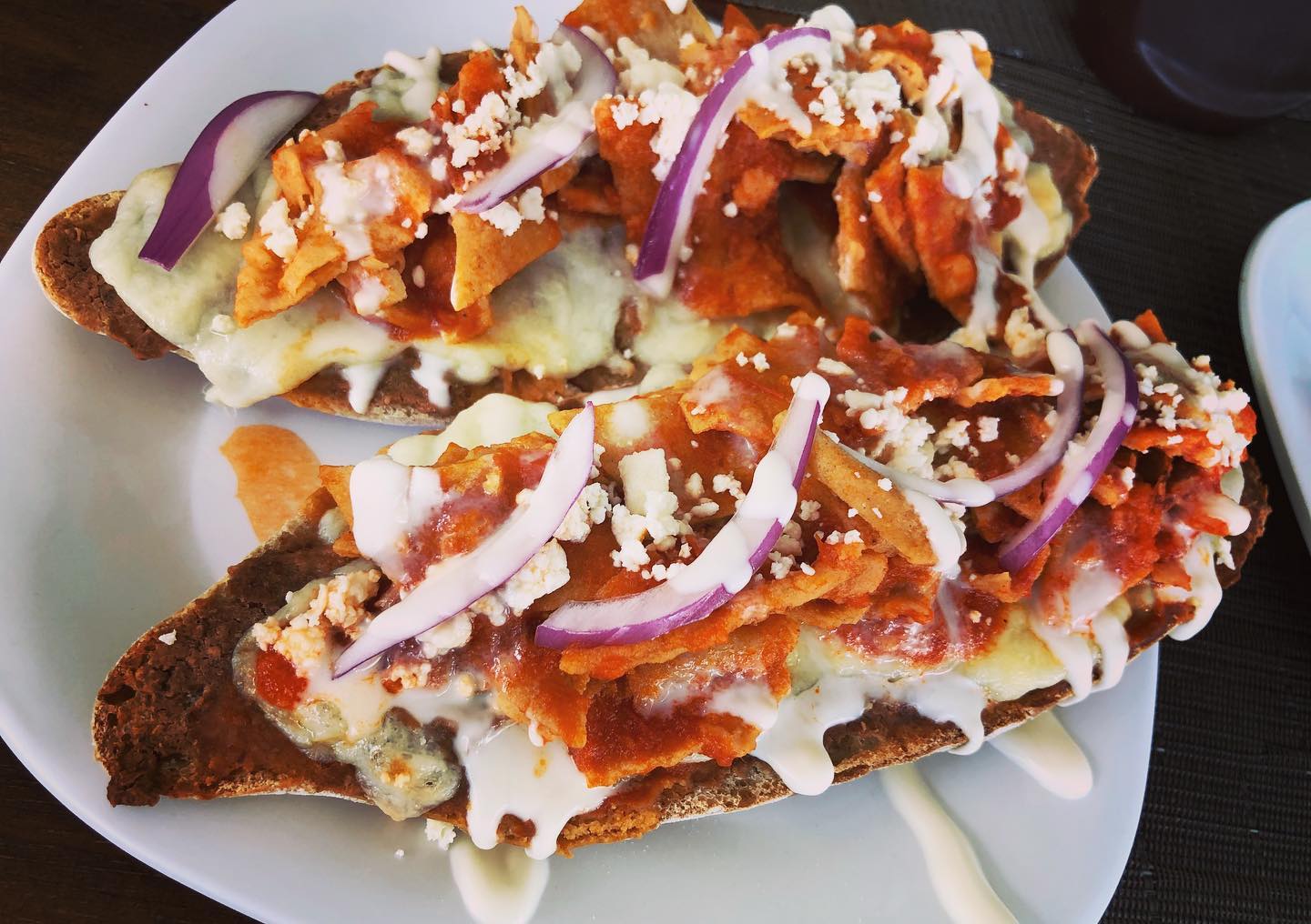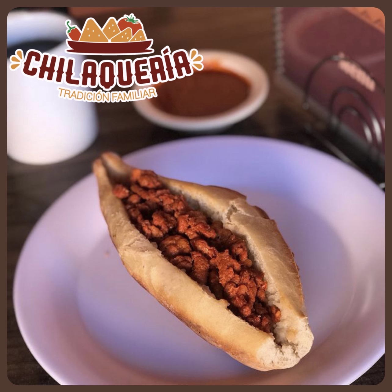 Relleno de chilaquiles rojos o verdes, queso fundido, crema, queso molido y cebolla. Incluye frijol, birote o tortillas.