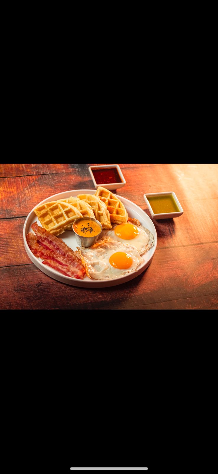 Waffle, 2 huevos revueltos o estrellados, tocino acompañados de frijol.