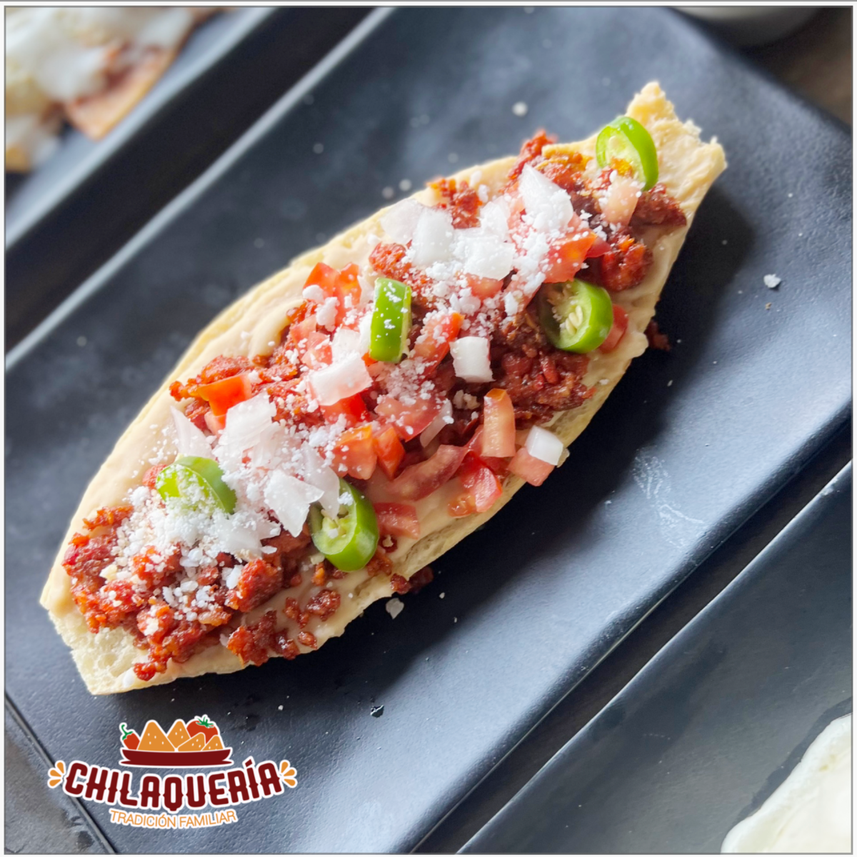 Salsa chipotle picosa, panela, chile toreado. Acompañados con queso, crema, cebolla, frijol y birote.