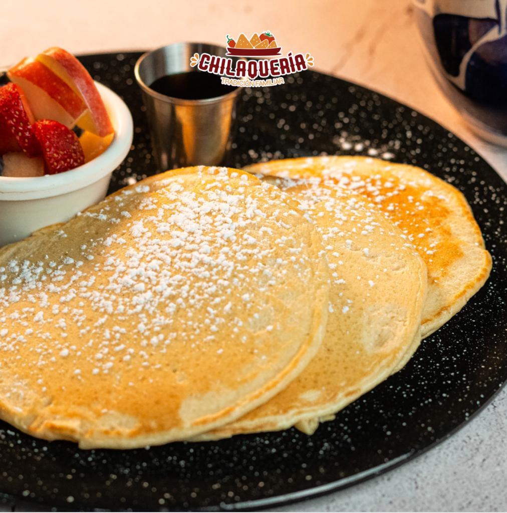 3 Piezas de hotcakes acompañados de 60grsde fruta mixta.