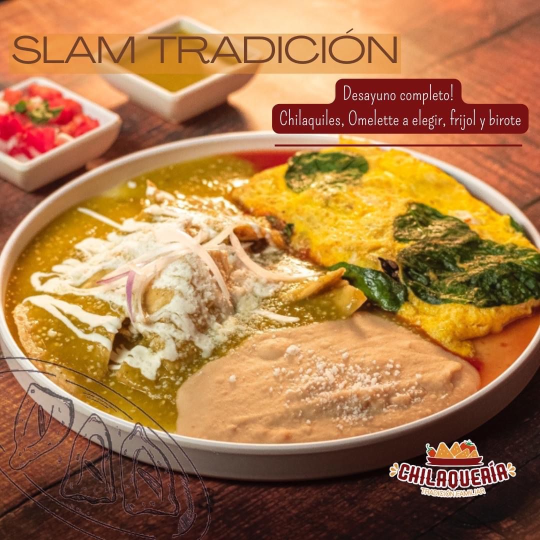 Chilaquiles rojos o verdes sencillos, omelette a elegir, frijoles y birote.