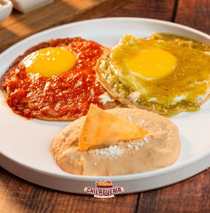 2 Huevos estrellados sobre 2 tortillas fritas. Bañados en salsa roja o verde. Incluye frijol, birote o tortillas.