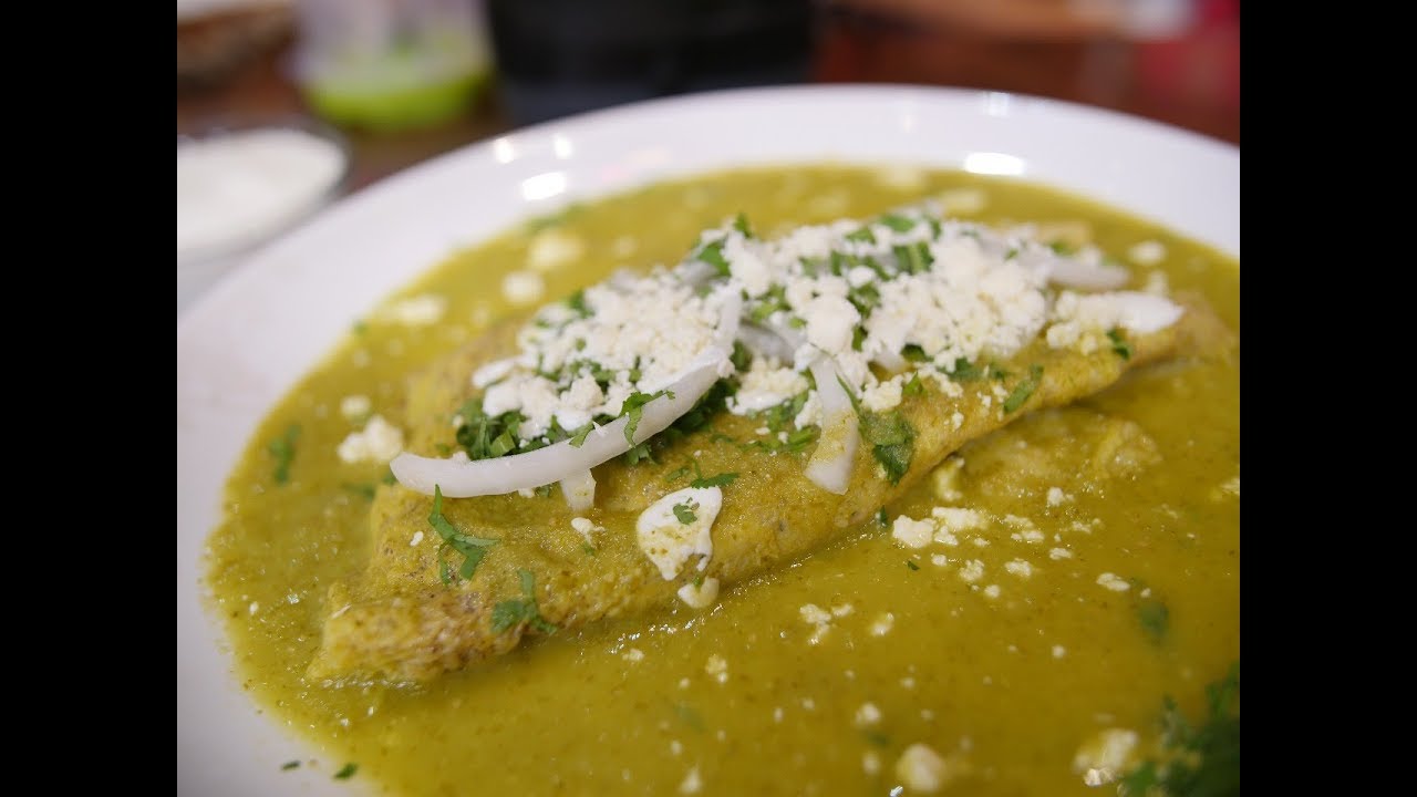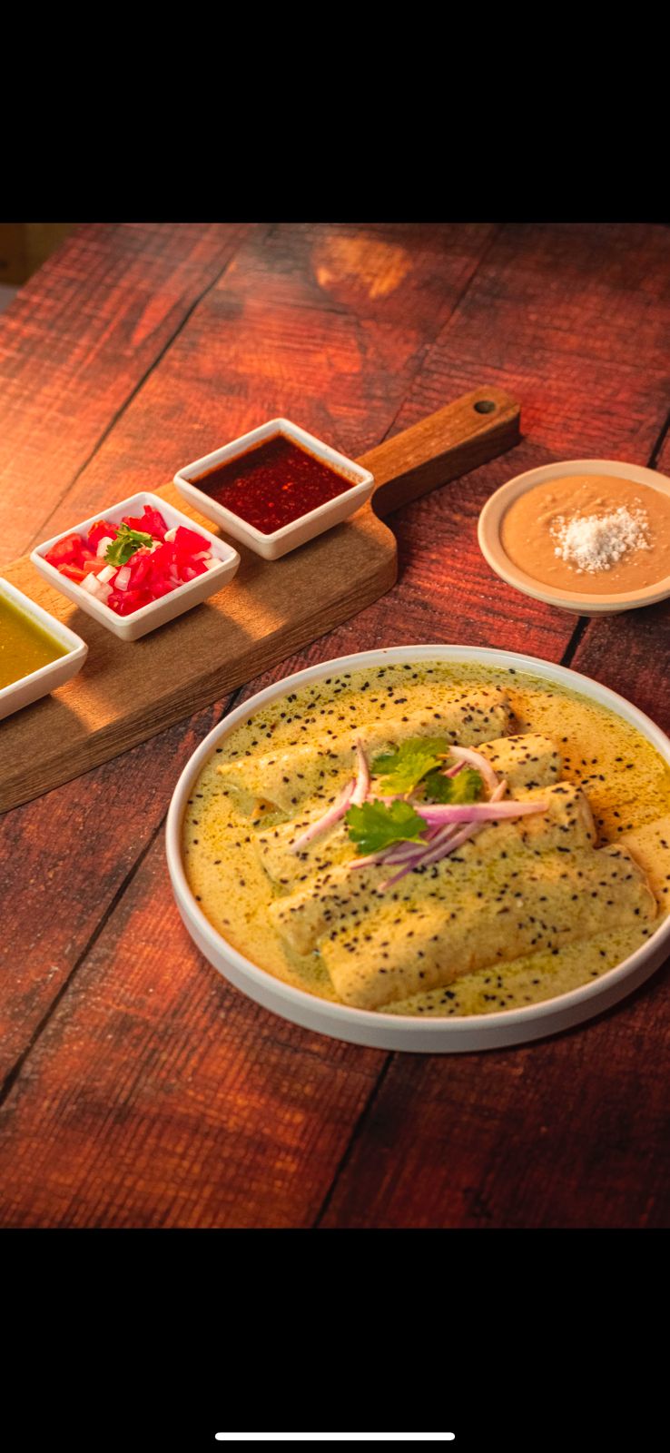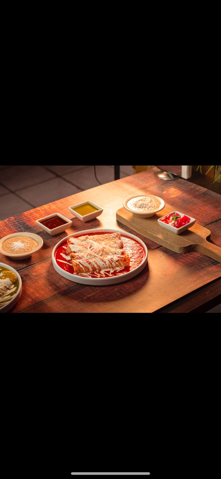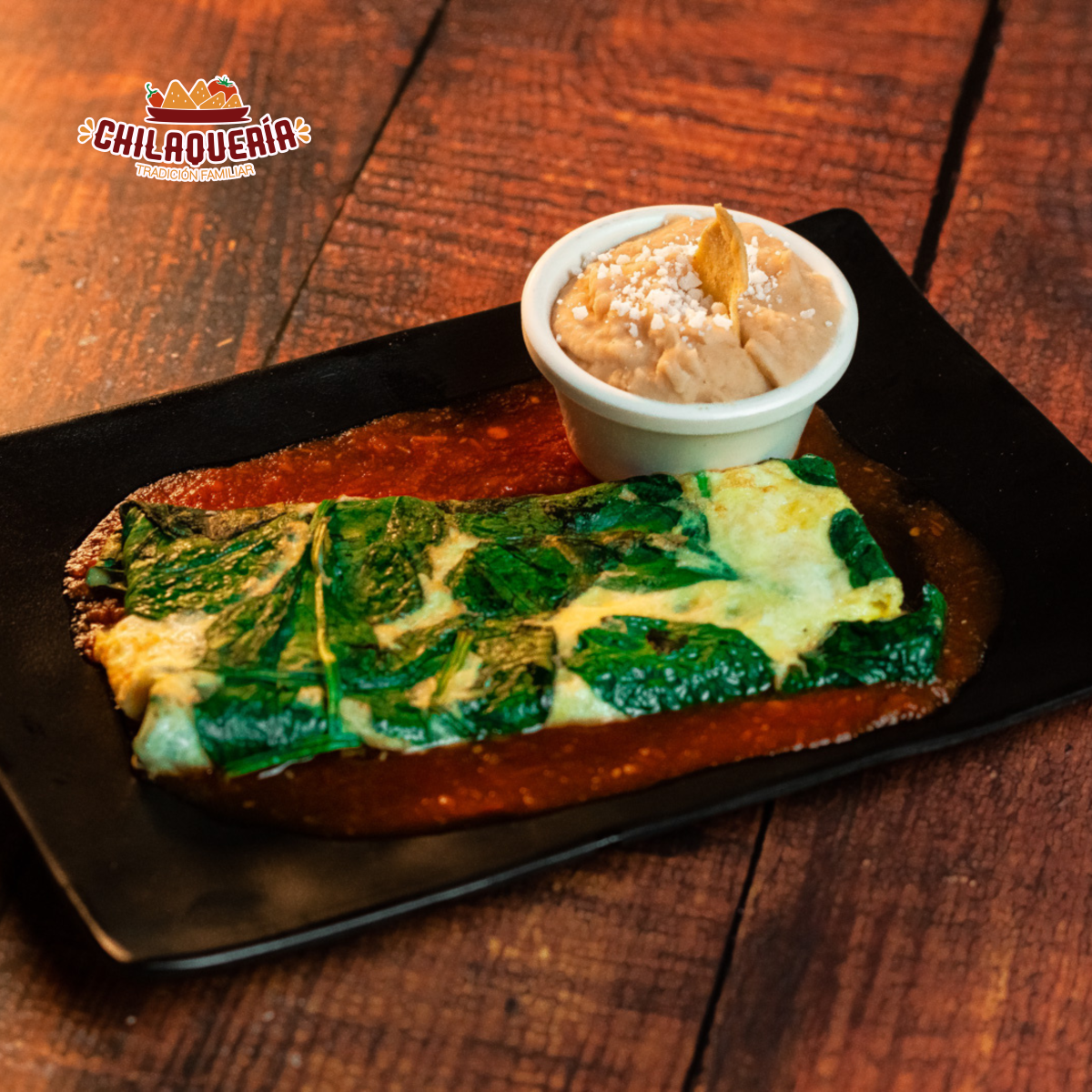 Forrado de espinaca, relleno de panela y champiñones, sobre salsa roja. Incluye frijol, birote o tortillas.