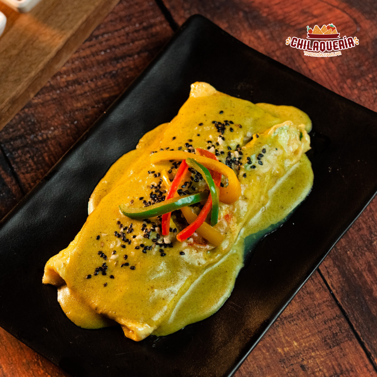 Relleno de pimientos y cebolla salteados, queso fundido, cubierto de crema poblana. Incluye frijol, birote o tortillas.