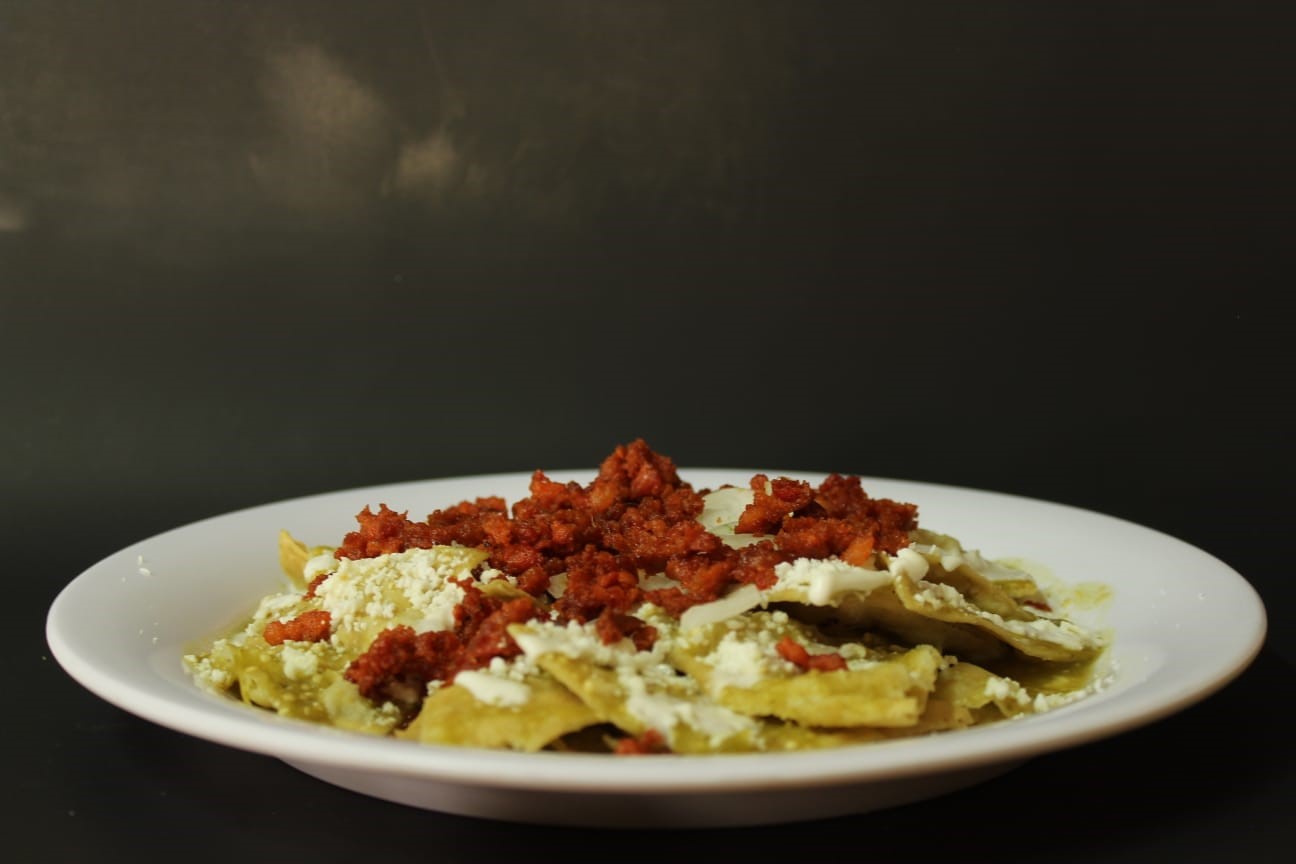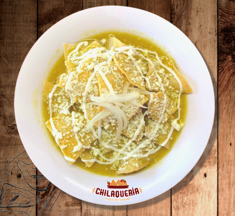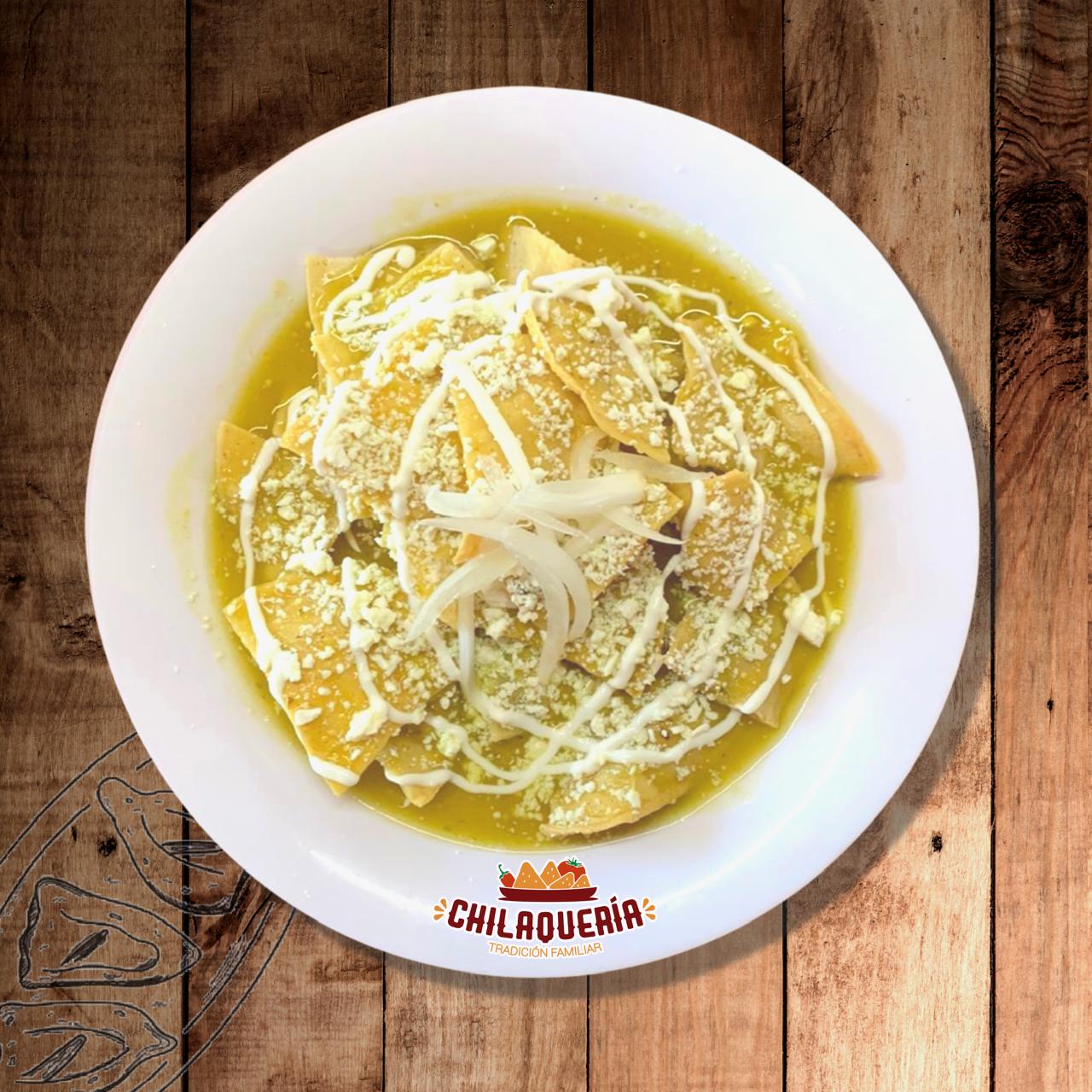 Chilaquiles con la salsa a elección. Acompañados con queso, crema, cebolla, frijol y birote.