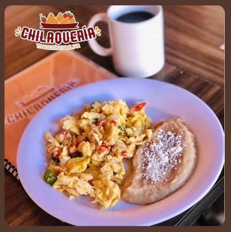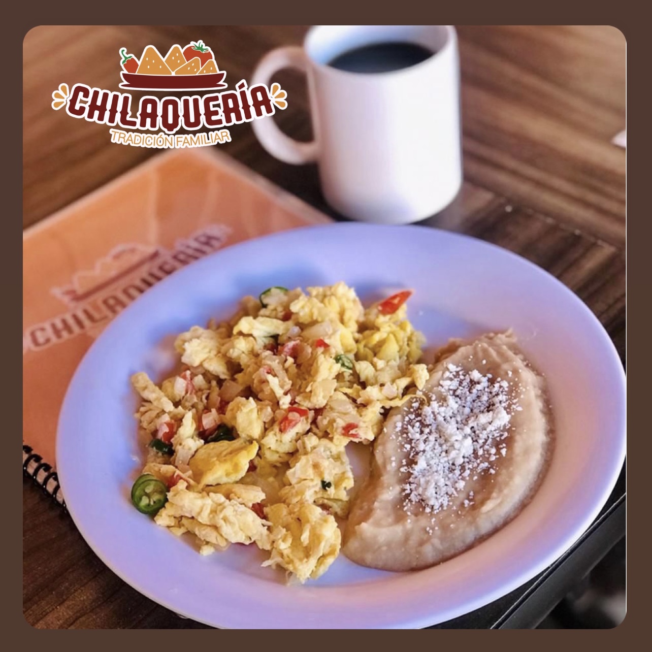 2 Huevos revueltos con machaca, chilaquiles rojos o verdes sencillos, frijol y 1 mollete dulce a elegir.