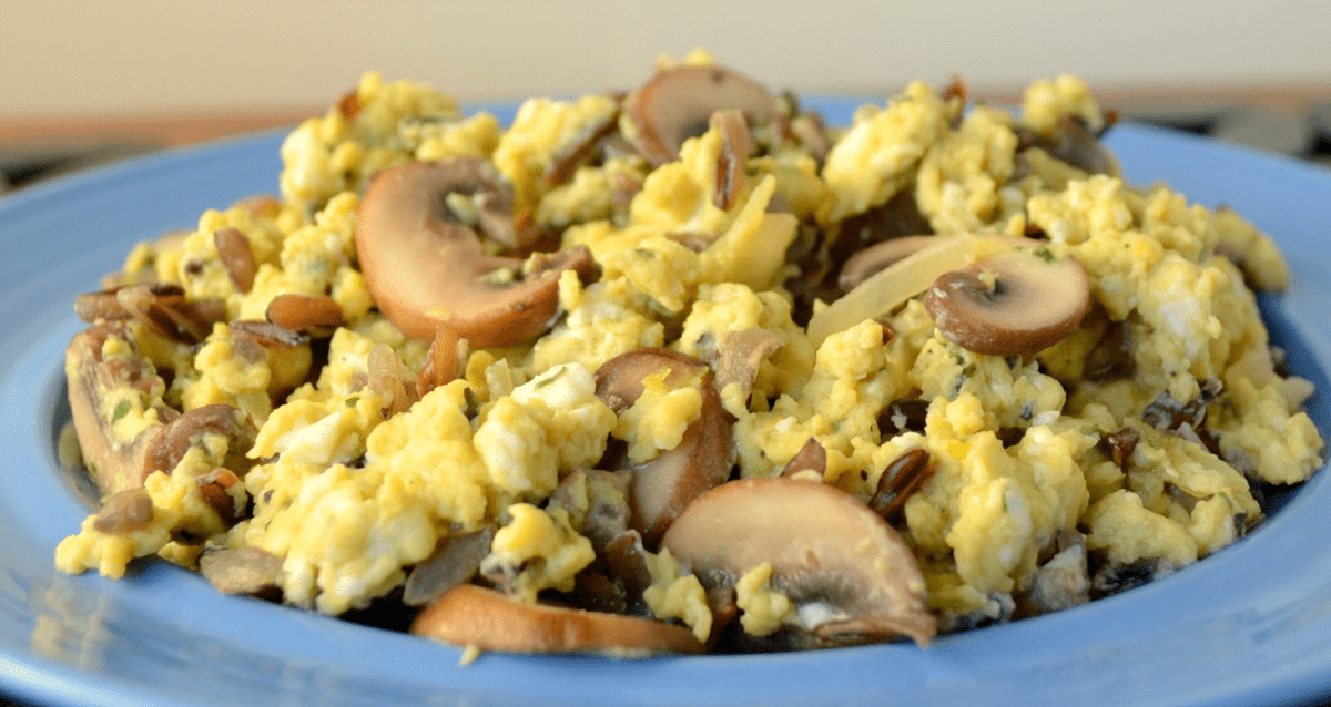 2 Huevos revueltos en torta con champiñones, cebolla, cilandro, frijol y medio birote.