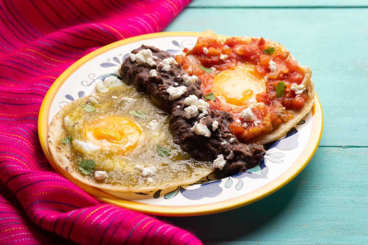Rojos, verdes o divorciados, cubiertos de queso fundido. Acompañados con queso, crema, cebolla, frijol y birote.