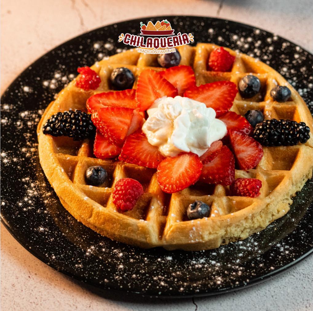 Waffle acompañado de frutos rojos mixtos, crema batida y azúcar glass.