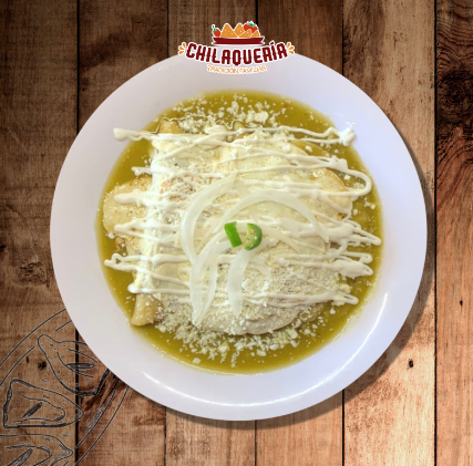 4 Enchiladas rellenas de pollo bañadas en salsa verde con un toque de serrano, queso molido, crema, cebolla. Frijol.