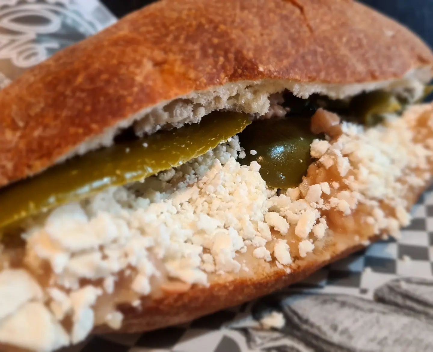 Mollete de medio birote con base de frijoles y chilaquiles rojos o verdes.