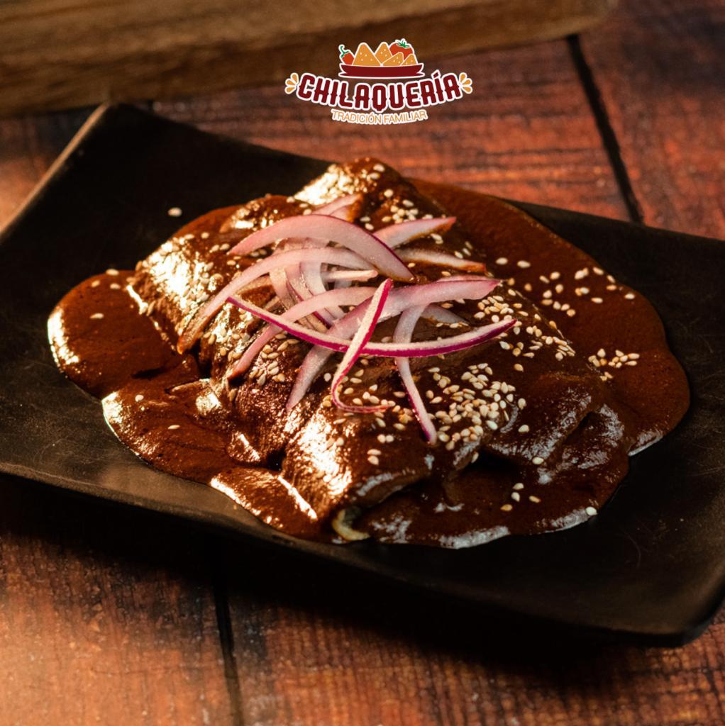Mole poblano, ajonjolí, cebolla morada (solo dorados). Acompañados con queso, crema, cebolla, frijol y birote.