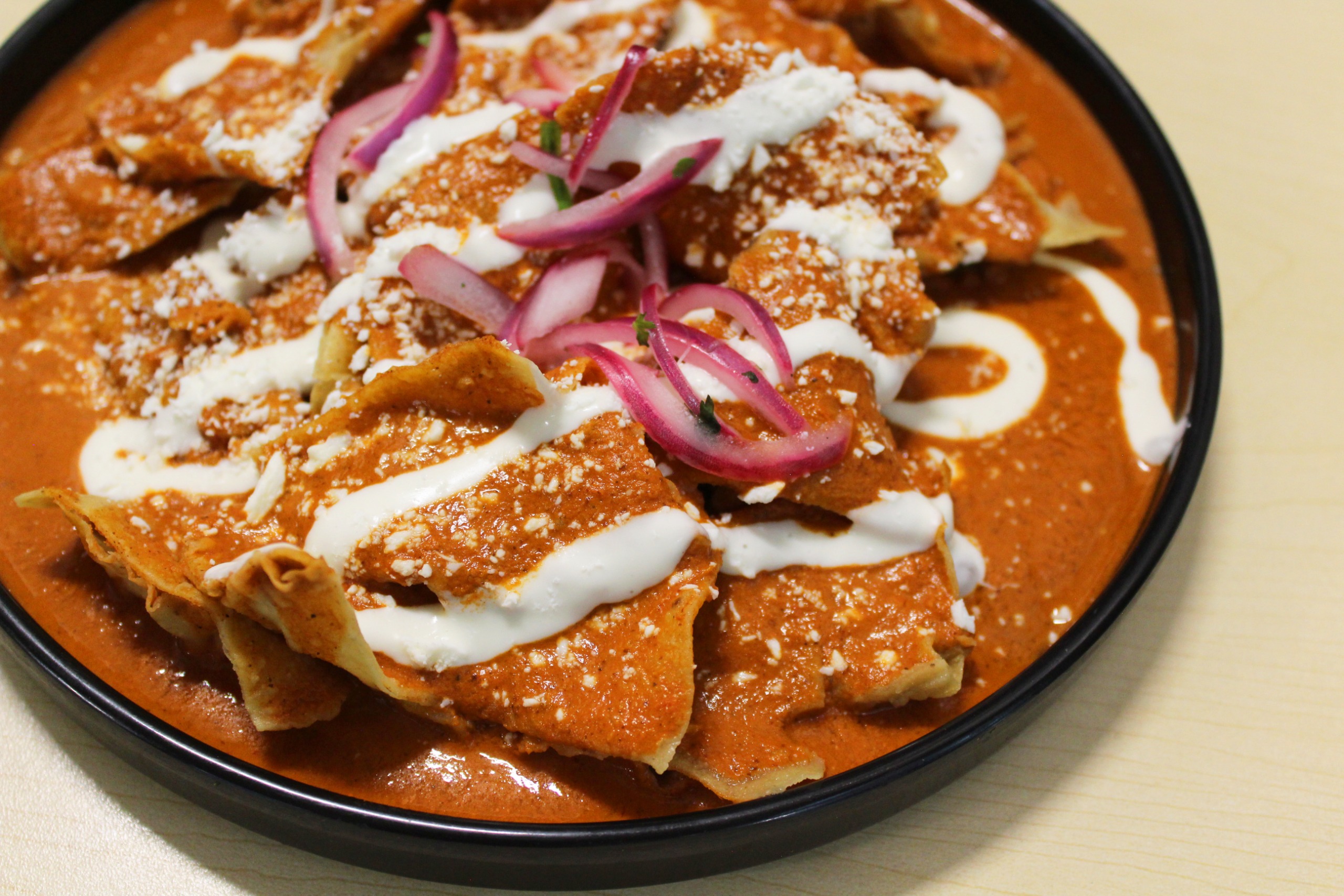 Chilaquiles con totopo dorado, bañados en mole, cebolla, queso, frijol y birote