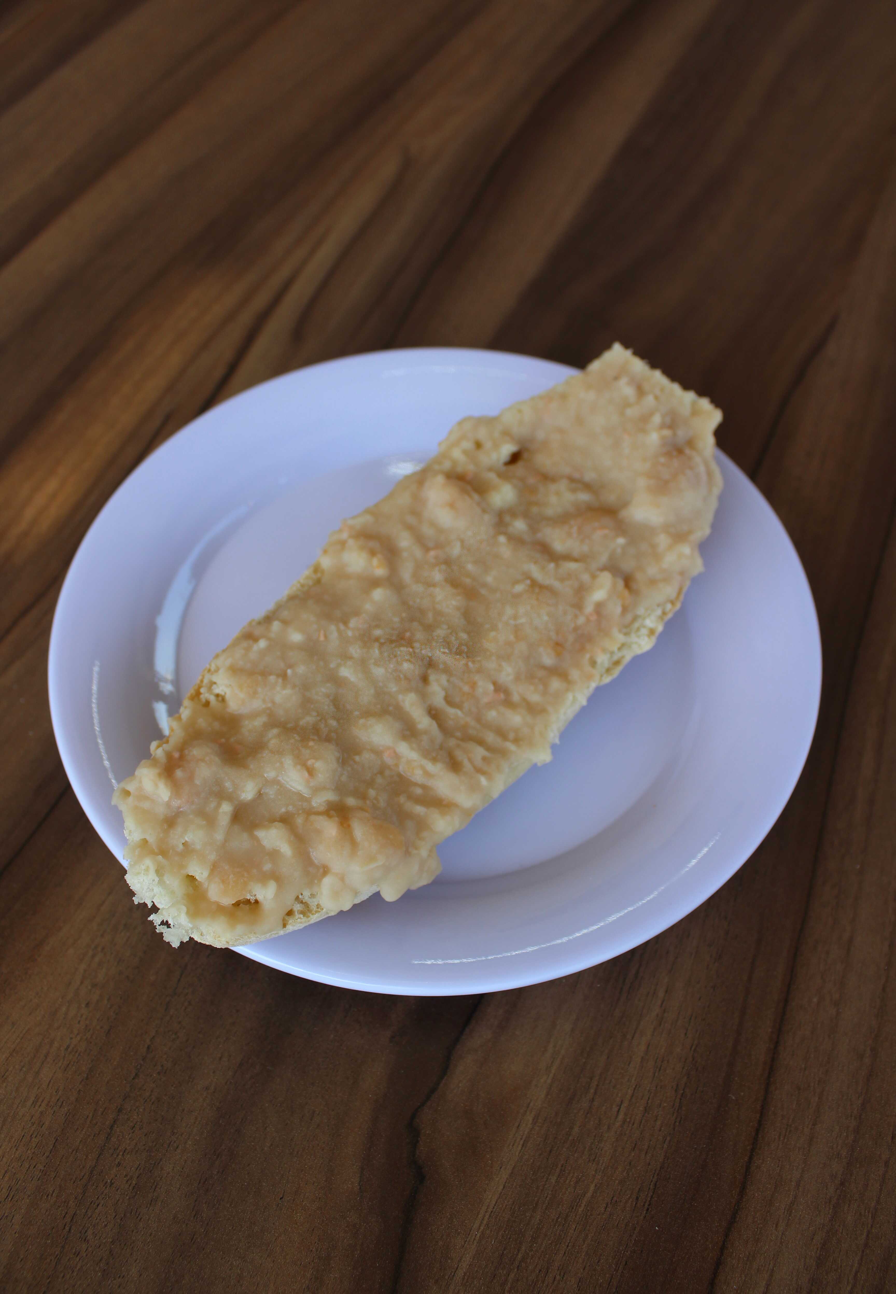 Mollete de medio birote con cama de mantequilla, con cajeta o mermelada de fresa.