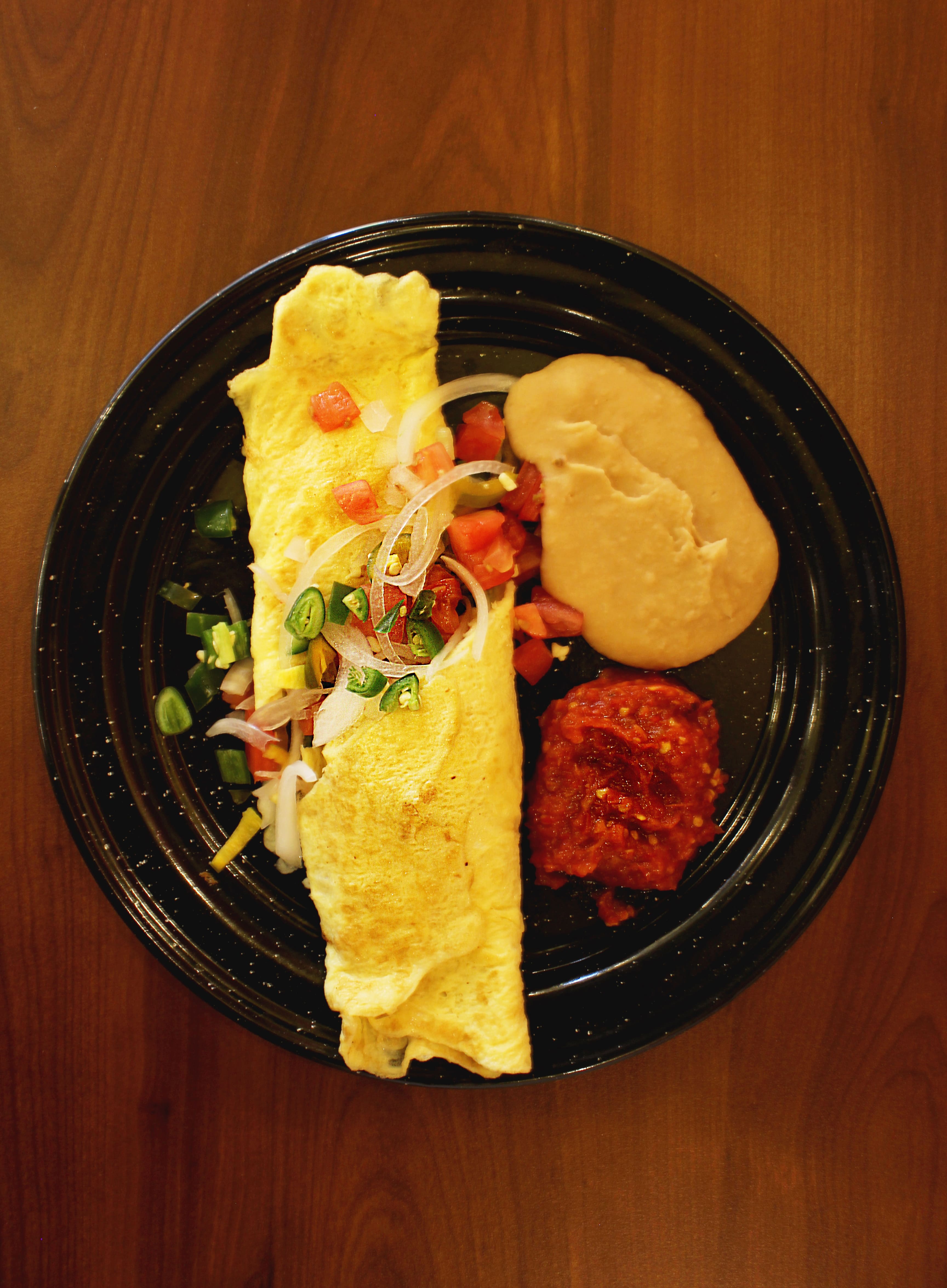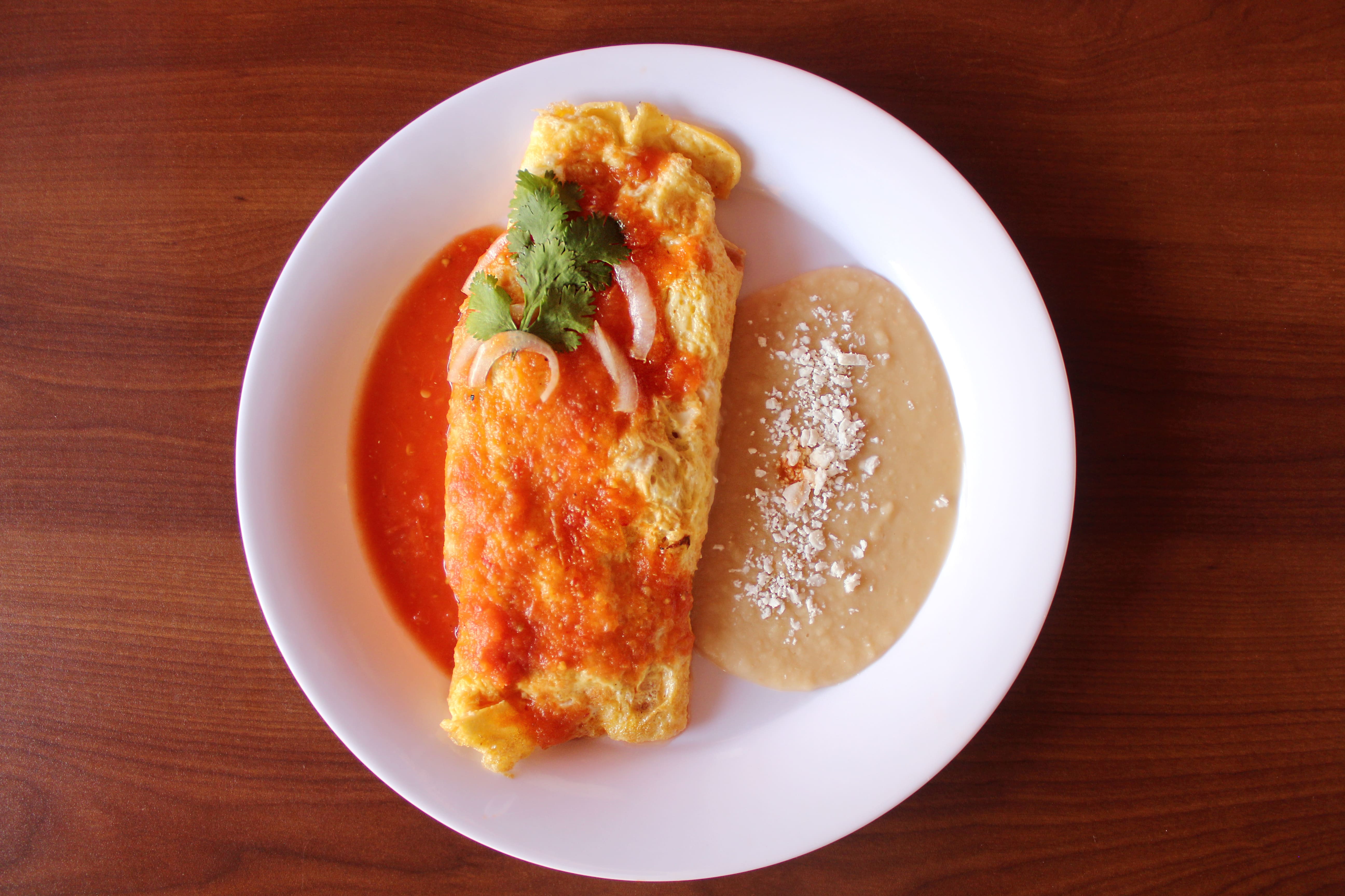 Omelette relleno de salsa mexicana, chorizo, frijol y birote, acompañado con salsa picante.