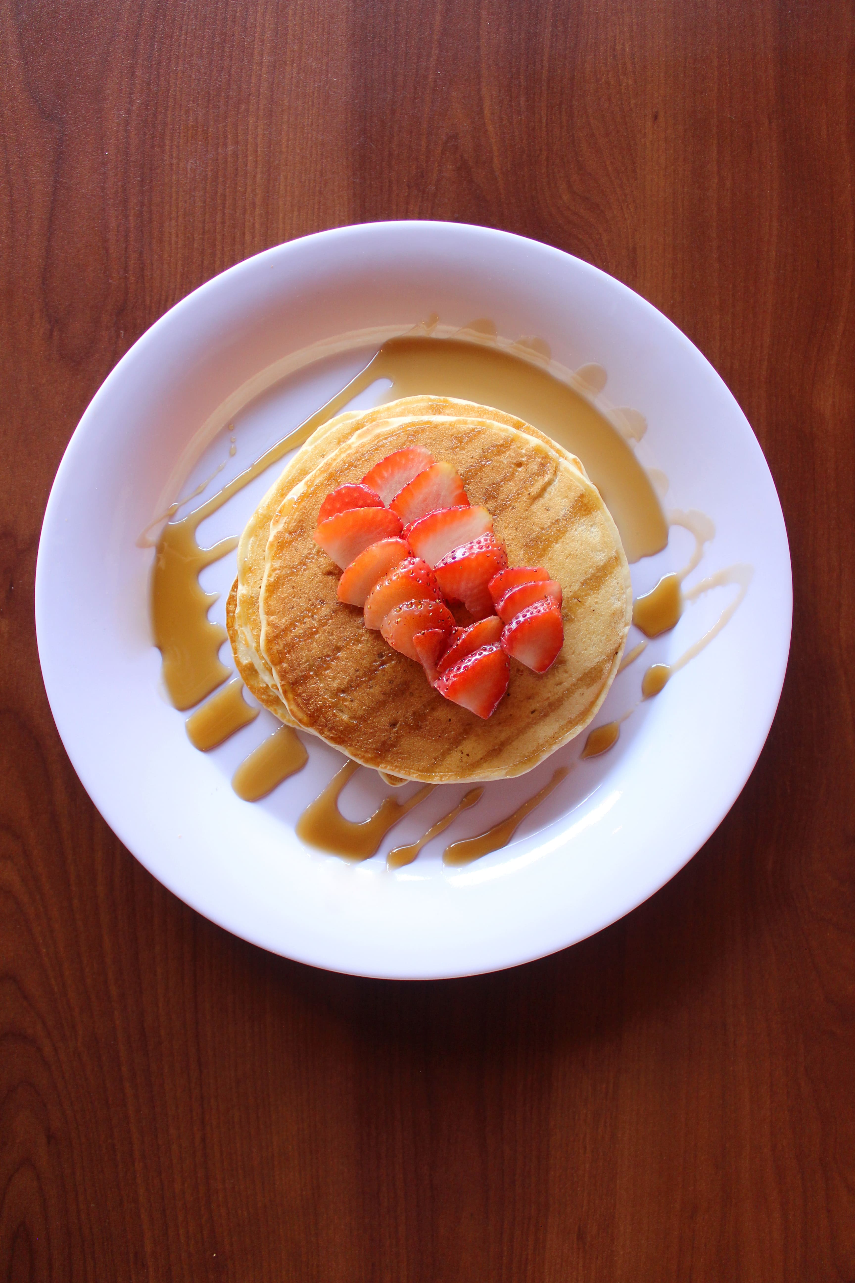 3 Hot cakes acompañados con una porción de fruta de temporada y miel de maple.