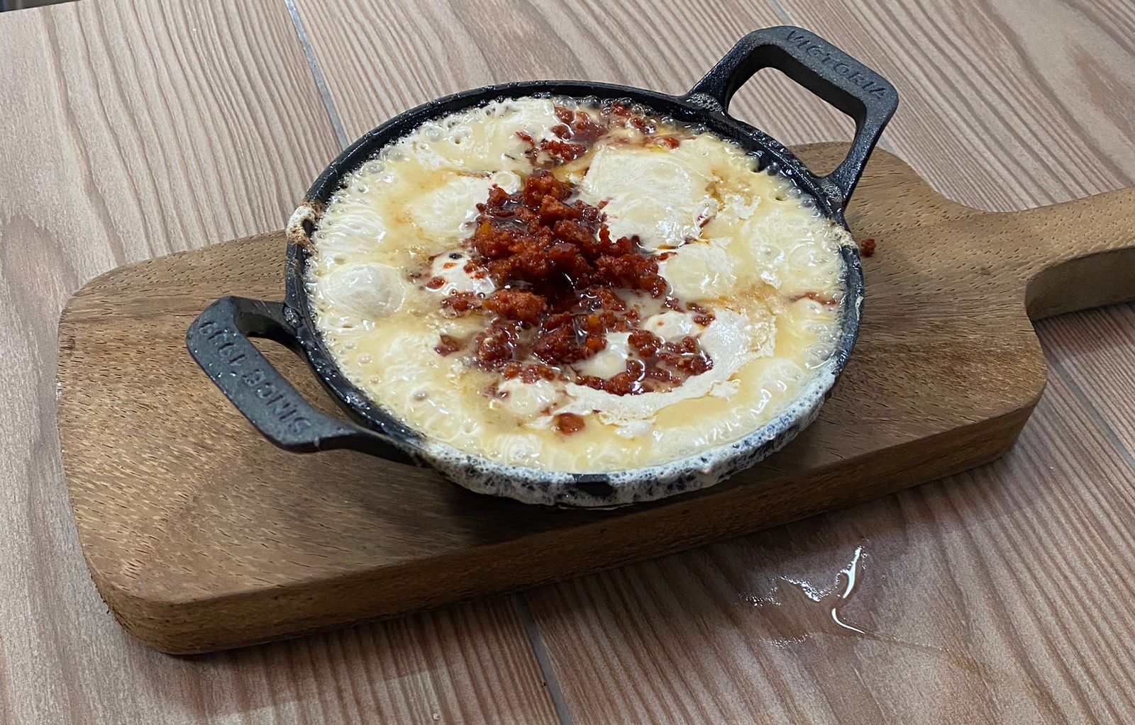 240 gr de Queso fundido, 60 gr de Chorizo, 5 tortillas, cebolla guisada y chile toreado