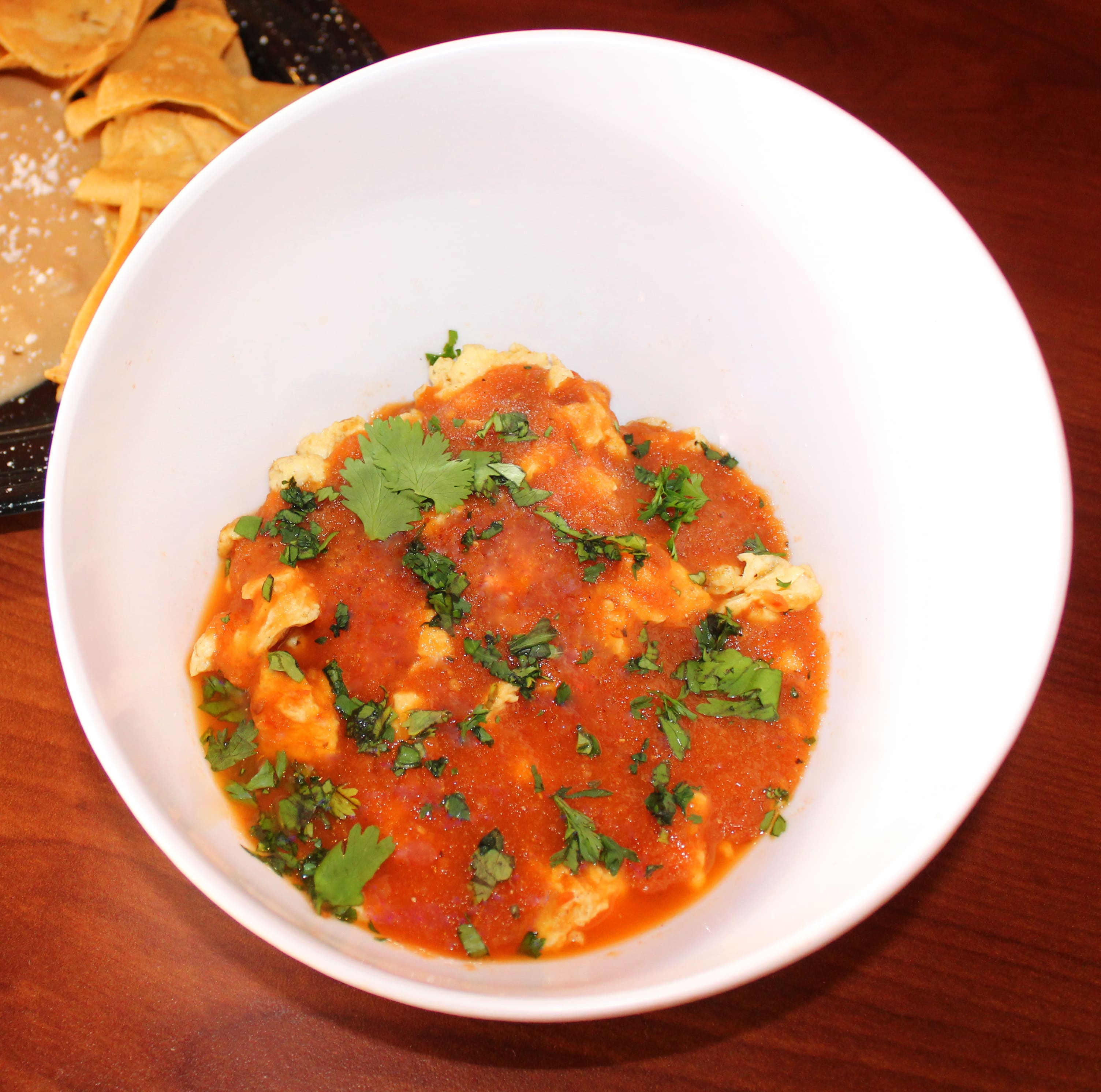 2 Huevos picados, bañados con salsa roja, acompañados de totopo dorado, frijol y medio birote.