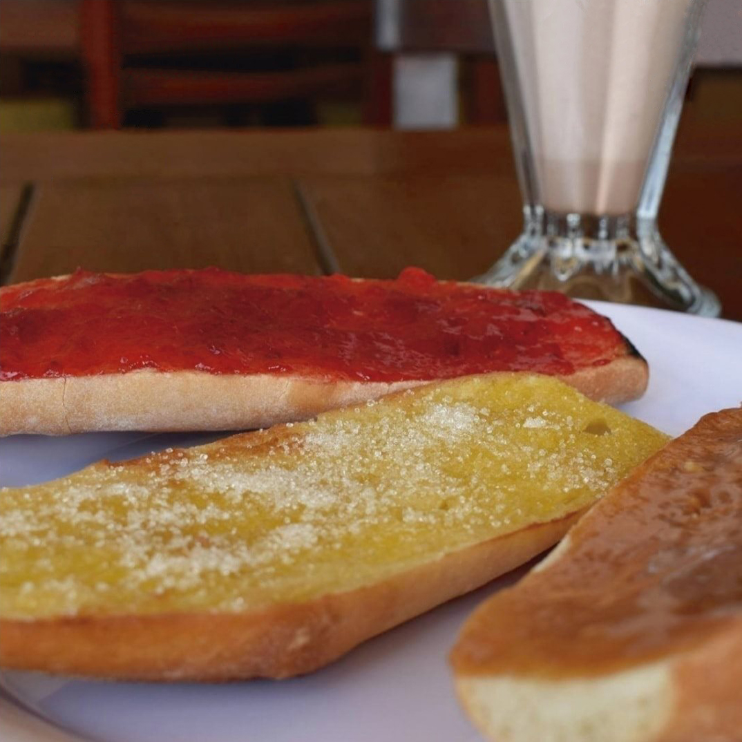 Mollete de medio birote con mantequilla o cajeta o mermelada de fresa.